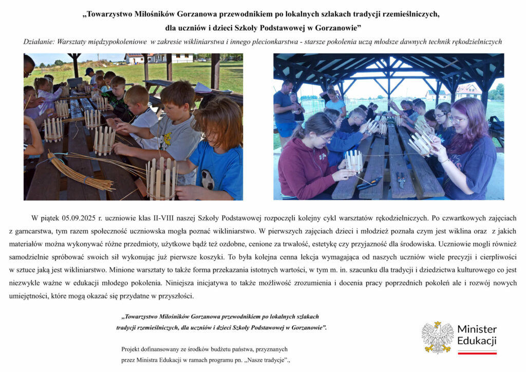 W piątek 05.09.2025 r. uczniowie klas II-VIII naszej Szkoły Podstawowej rozpoczęli kolejny cykl warsztatów rękodzielniczych. Po czwartkowych zajęciach z garncarstwa, tym razem społeczność uczniowska mogła poznać wikliniarstwo. W pierwszych zajęciach dzieci i młodzież poznała czym jest wiklina oraz z jakich materiałów można wykonywać różne przedmioty, użytkowe bądź też ozdobne, cenione za trwałość, estetykę czy przyjazność dla środowiska. Uczniowie mogli również samodzielnie spróbować swoich sił wykonując już pierwsze koszyki. To była kolejna cenna lekcja wymagająca od naszych uczniów wiele precyzji i cierpliwości w sztuce jaką jest wikliniarstwo. Minione warsztaty to także forma przekazania istotnych wartości, w tym m. in. szacunku dla tradycji i dziedzictwa kulturowego co jest niezwykle ważne w edukacji młodego pokolenia. Niniejsza inicjatywa to także możliwość zrozumienia i docenia pracy poprzednich pokoleń ale i rozwój nowych umiejętności, które mogą okazać się przydatne w przyszłości.