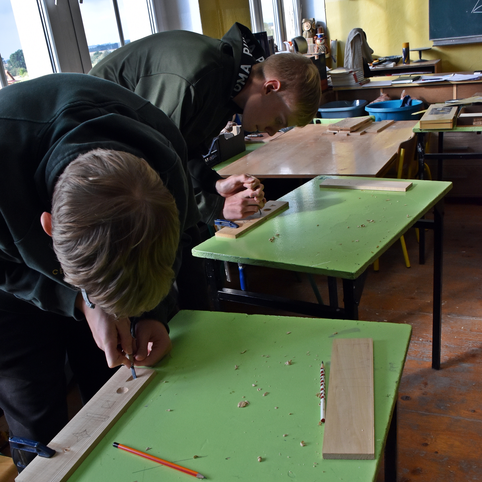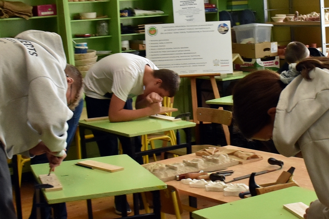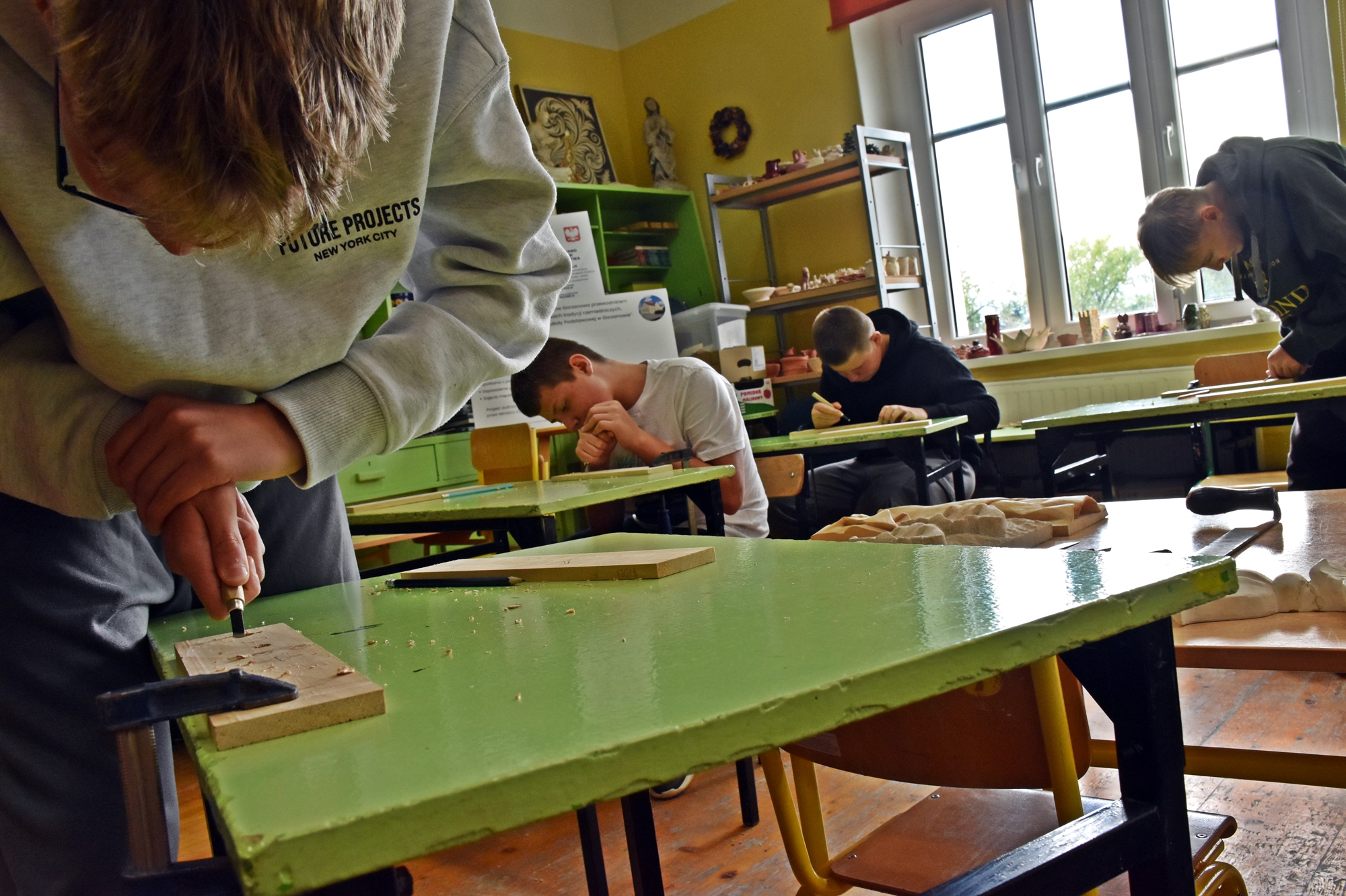 Podczas zajęć, po wprowadzeniu w tematykę rzeźby w drewnie, płaskorzeźby, drzeworytu, linorytu i trasowania, uczniowie mogli poznać liczne narzędzia stolarskie i snycerskie oraz przykładowe prace rzeźbiarskie. Po słowach wstępu omówiono podstawowe zasady bezpieczeństwa, co było kluczowe dla rozpoczęcia pierwszych prac z narzędziami. Pod czujnym okiem Prowadzącego oraz Wychowawców zapewniających dodatkową kontrolę, opiekę i wsparcie, uczniowie przy wykorzystaniu zakupionych w ramach projektu japońskich dłut rzeźbiarskich