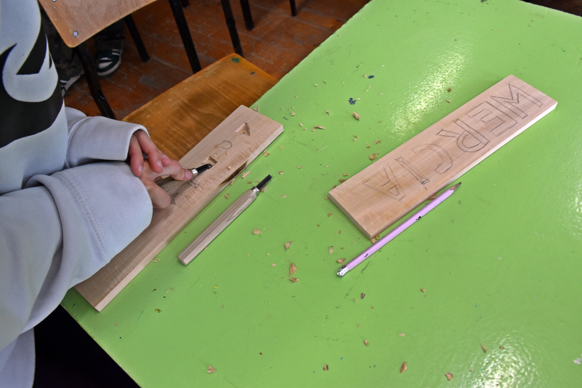 i lipowych desek przystąpili do nauki obsługi, właściwego trzymania i używania narzędzi. Nasi uczniowie utworzyli pierwsze projekty związane z liternictwem wklęsłym, nad którymi będą pracować podczas kolejnych zajęć, odbywających się w pracowni technicznej, która wkrótce zostanie doposażona w dwa nowe czterostanowiskowe, profesjonalne stoły stolarskie w ramach otrzymanych środków finansowych, wobec realizowanego projektu TMG.