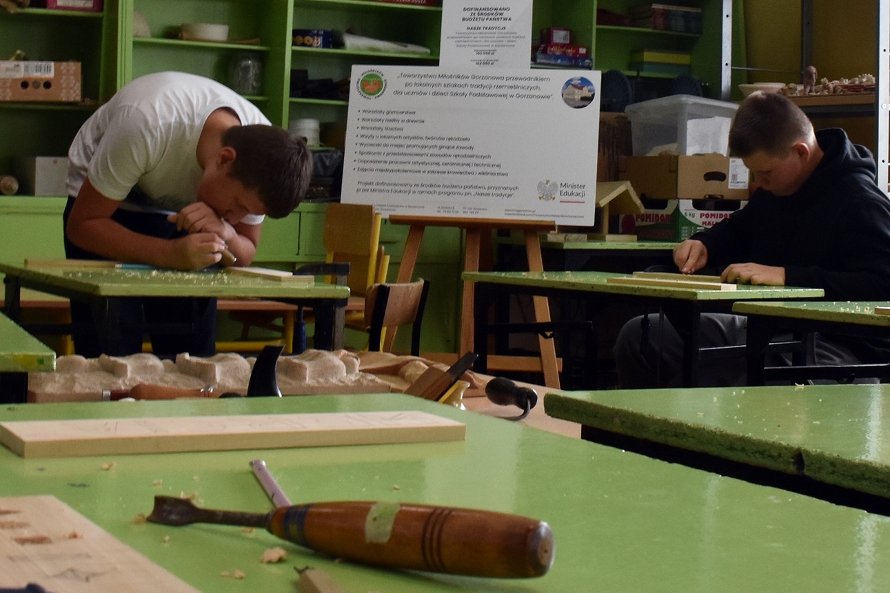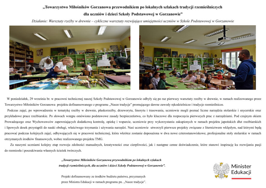 W poniedziałek, 29 września br. w pracowni technicznej naszej Szkoły Podstawowej w Gorzanowie odbyły się po raz pierwszy warsztaty rzeźby w drewnie, w ramach realizowanego przez Towarzystwo Miłośników Gorzanowa projektu dofinansowanego z programu ,,Nasze tradycje” promującego dawne zawody rękodzielnicze i tradycje rzemieślnicze.