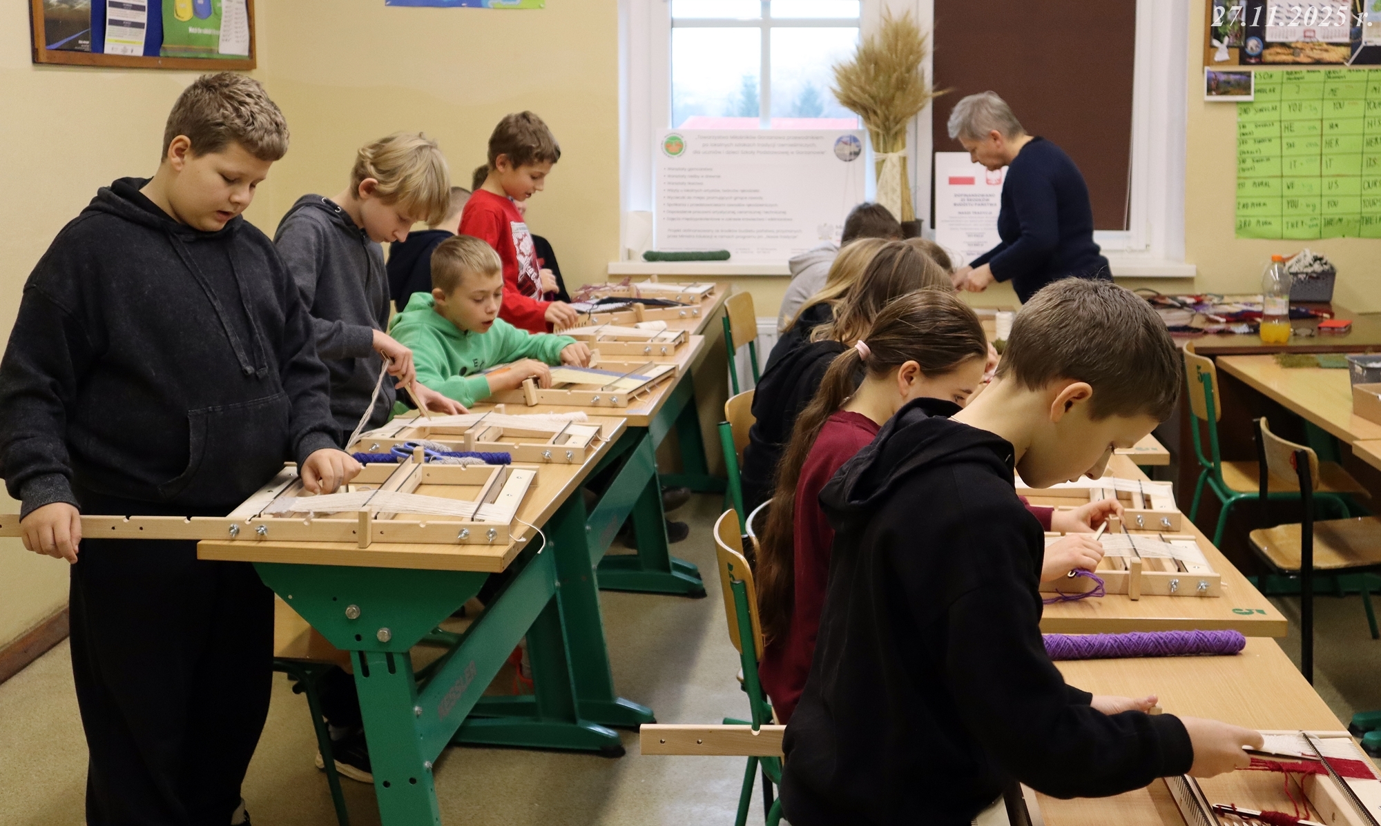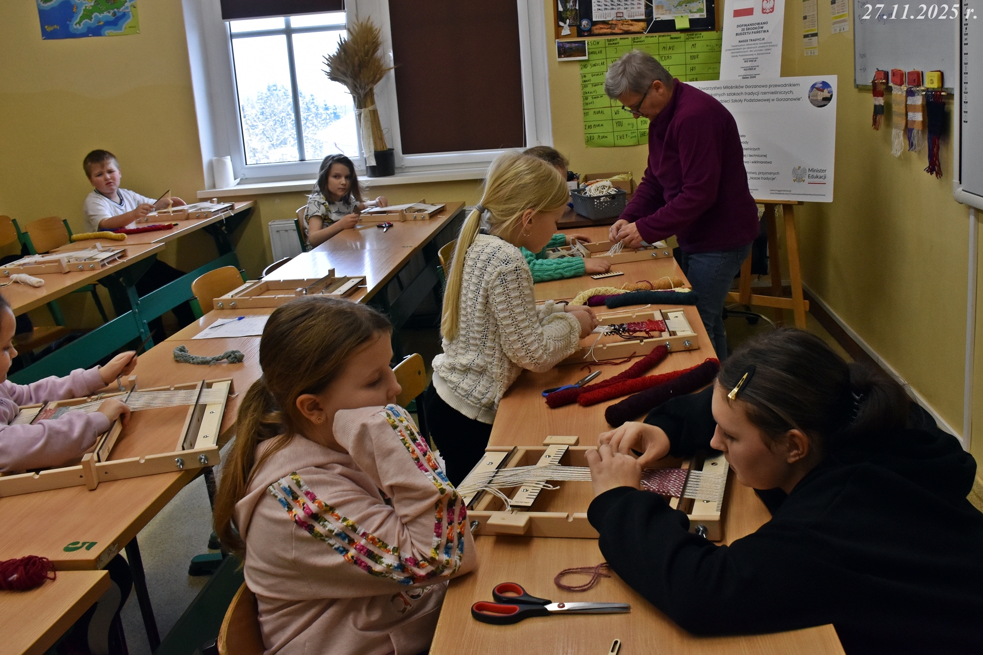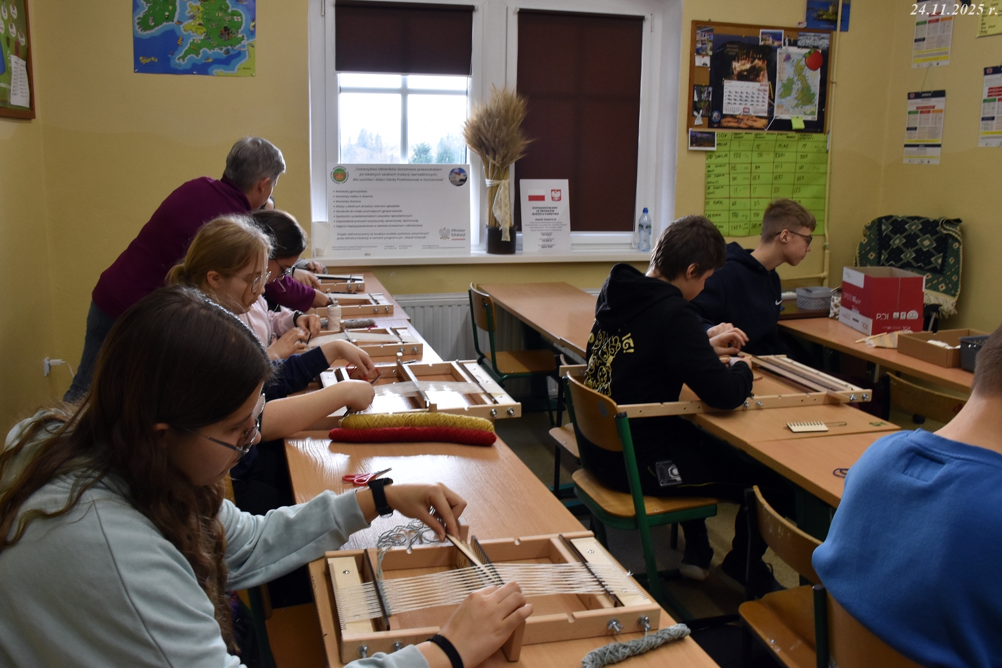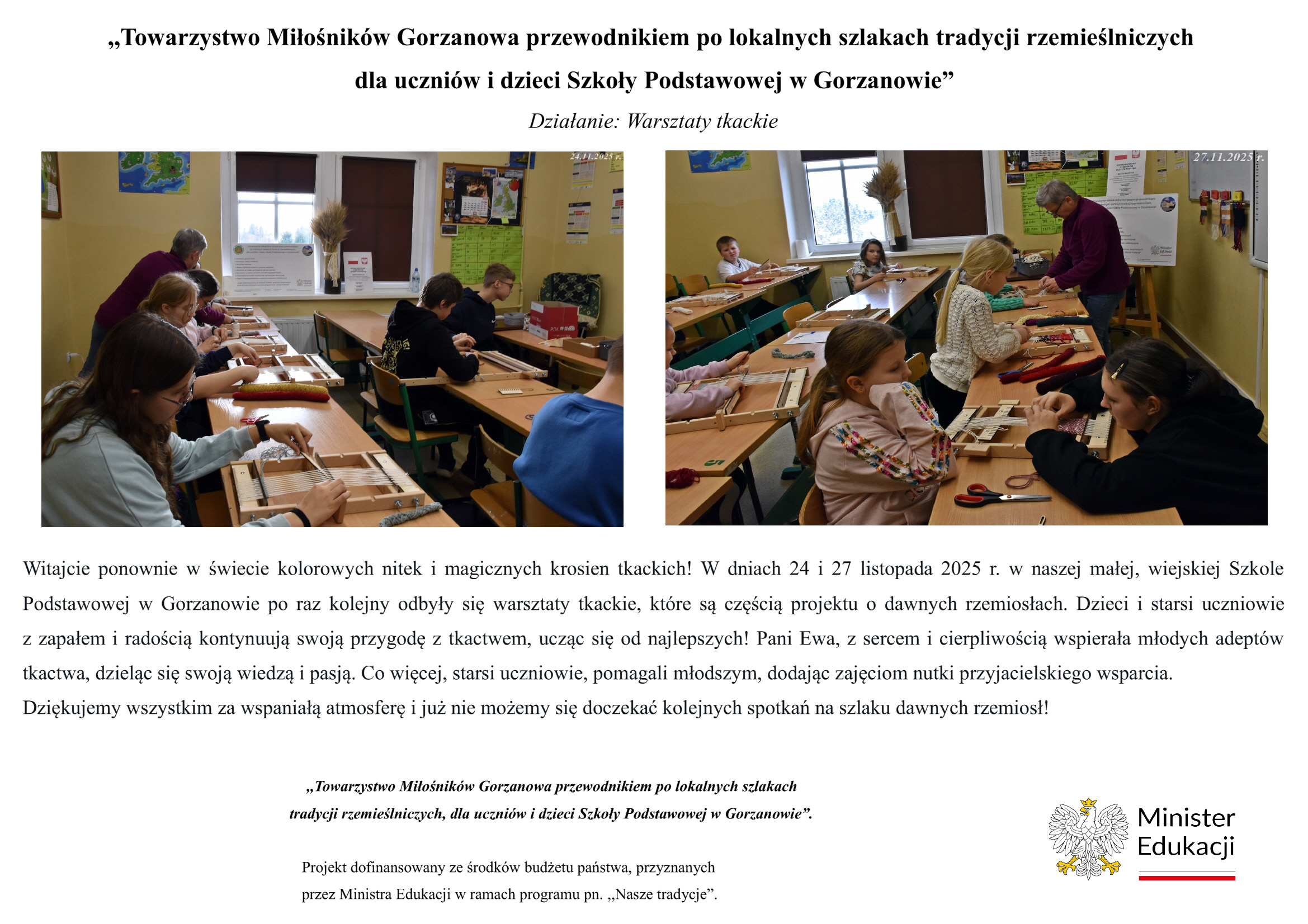 W dniach 24 i 27 listopada 2025 r. w naszej małej, wiejskiej Szkole Podstawowej w Gorzanowie po raz kolejny odbyły się warsztaty tkackie, które są częścią projektu o dawnych rzemiosłach. Dzieci i starsi uczniowie z zapałem i radością kontynuują swoją przygodę z tkactwem, ucząc się od najlepszych! Pani Ewa, z sercem i cierpliwością wspierała młodych adeptów tkactwa, dzieląc się swoją wiedzą i pasją. Co więcej, starsi uczniowie, pomagali młodszym, dodając zajęciom nutki przyjacielskiego wsparcia.
