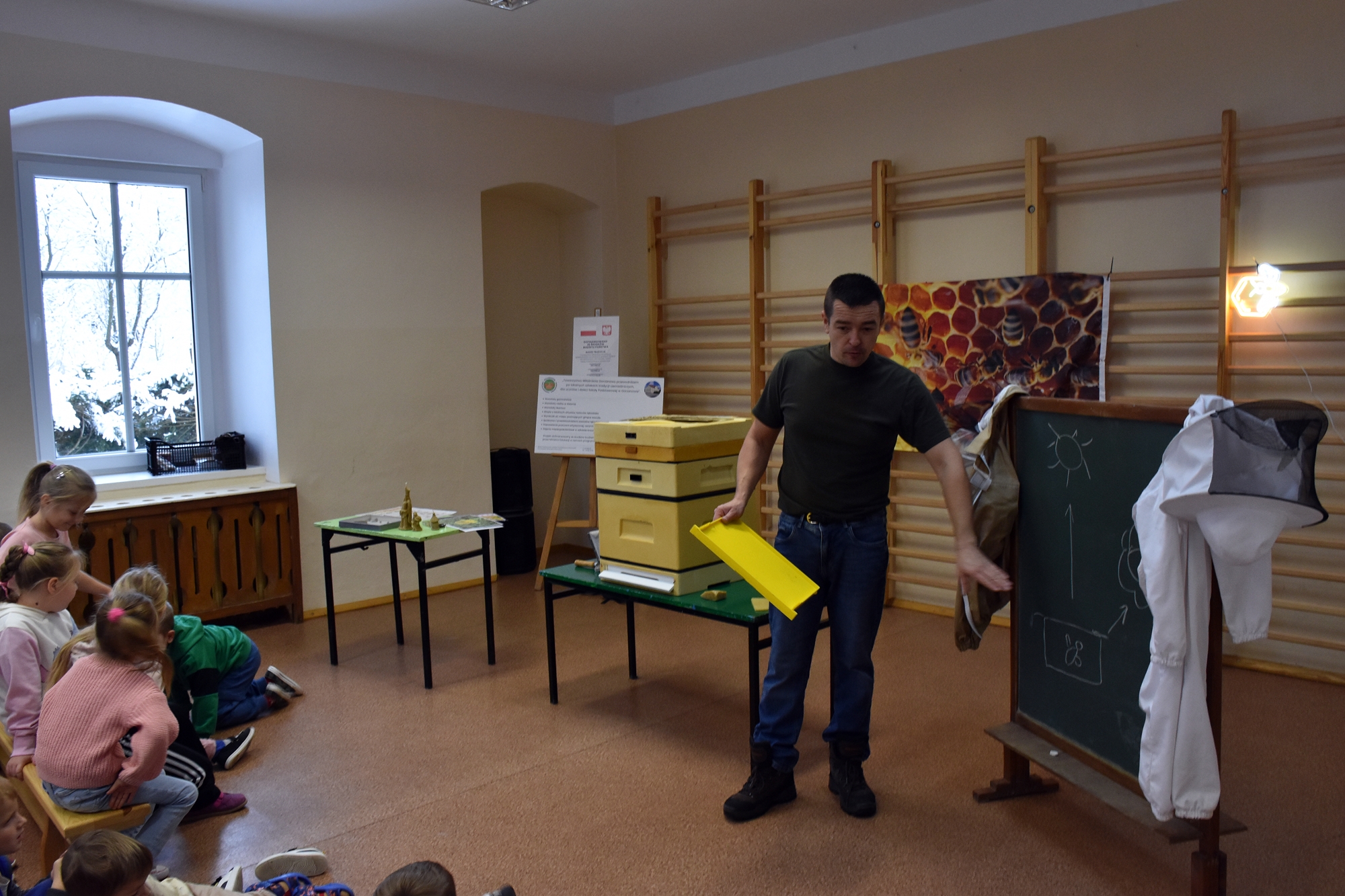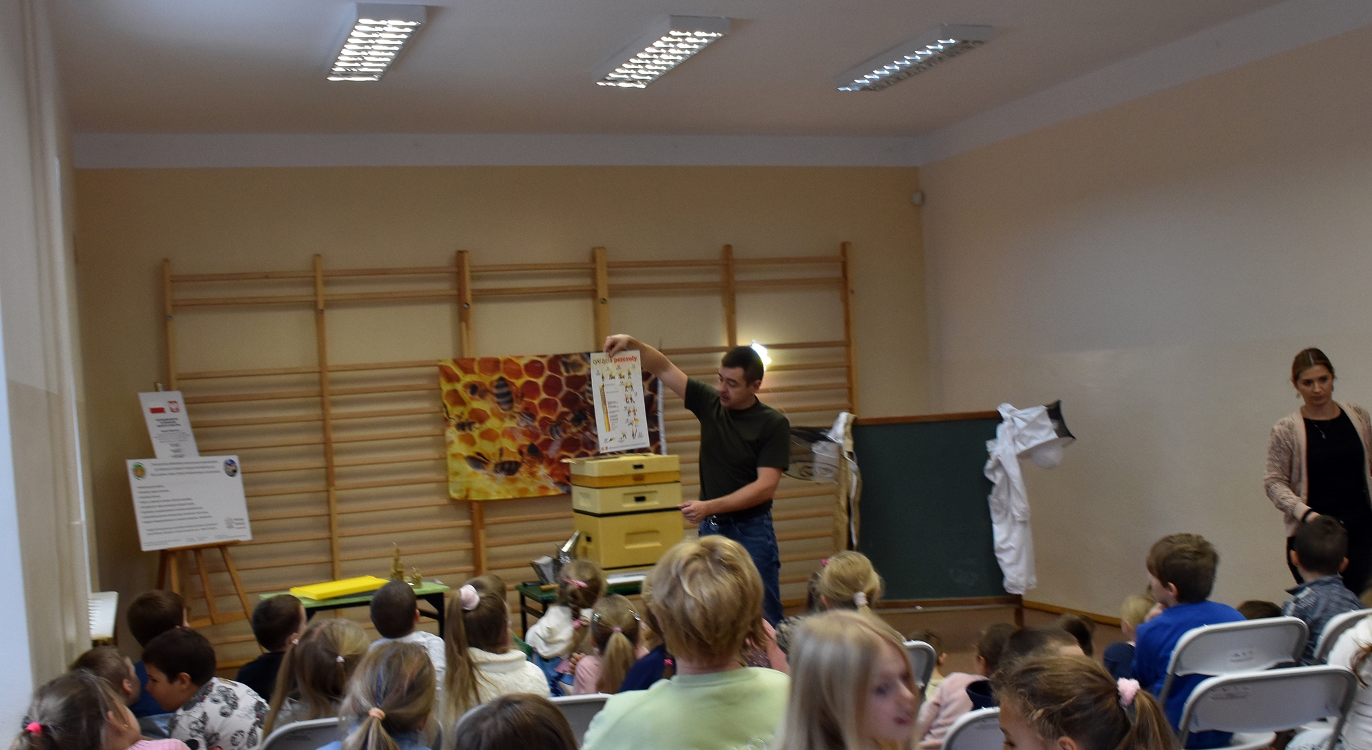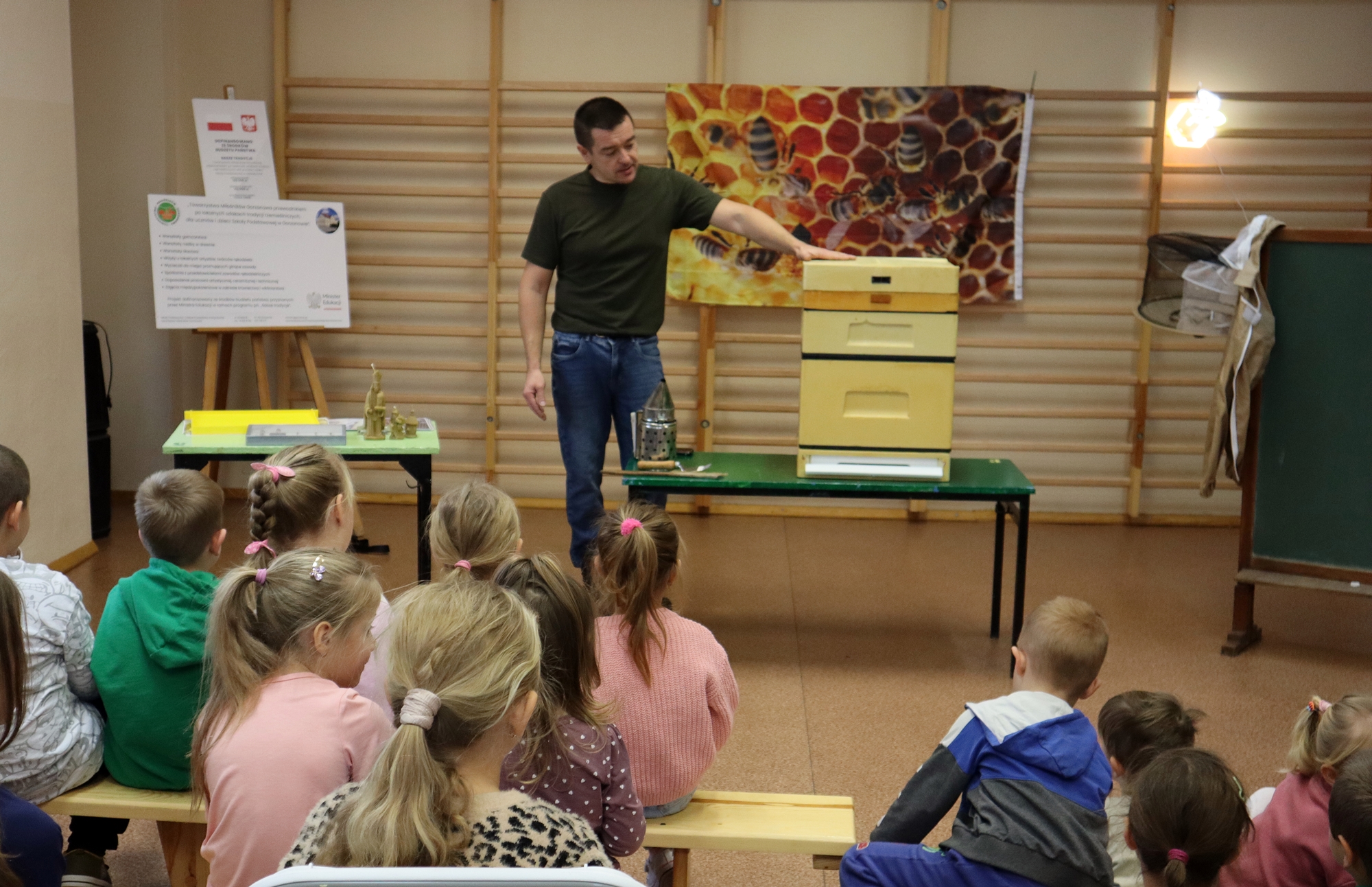 Podczas prezentacji dzieci miały okazję zobaczyć budowę ula oraz zrozumieć cykl rozwoju i budowę pszczoły miodnej. Pan Jacek zaprezentował także niezbędny strój ochronny oraz narzędzia i sprzęt, których używa podczas pracy przy ulach. Przybliżył nam również postać świętego Ambrożego, patrona pszczelarstwa. Spotkanie było interaktywne, a uczniowie wraz z nauczycielami aktywnie uczestniczyli, zadając wiele pytań. Wśród nich znalazły się nawet pytania dotyczące wymagań prawnych związanych z zawodem, co świadczy o dużym zainteresowaniu tematem. Wizyta ta nie tylko wzbogaciła wiedzę dzieci, ale także wzbudziła ich ciekawość i szacunek do tradycyjnych zawodów.