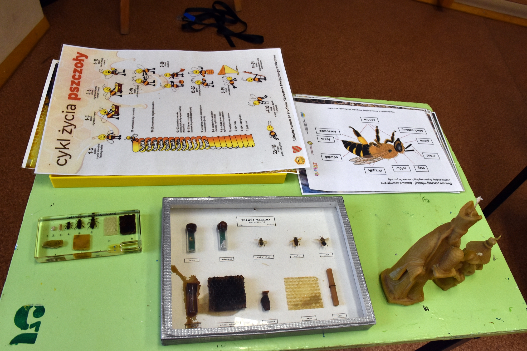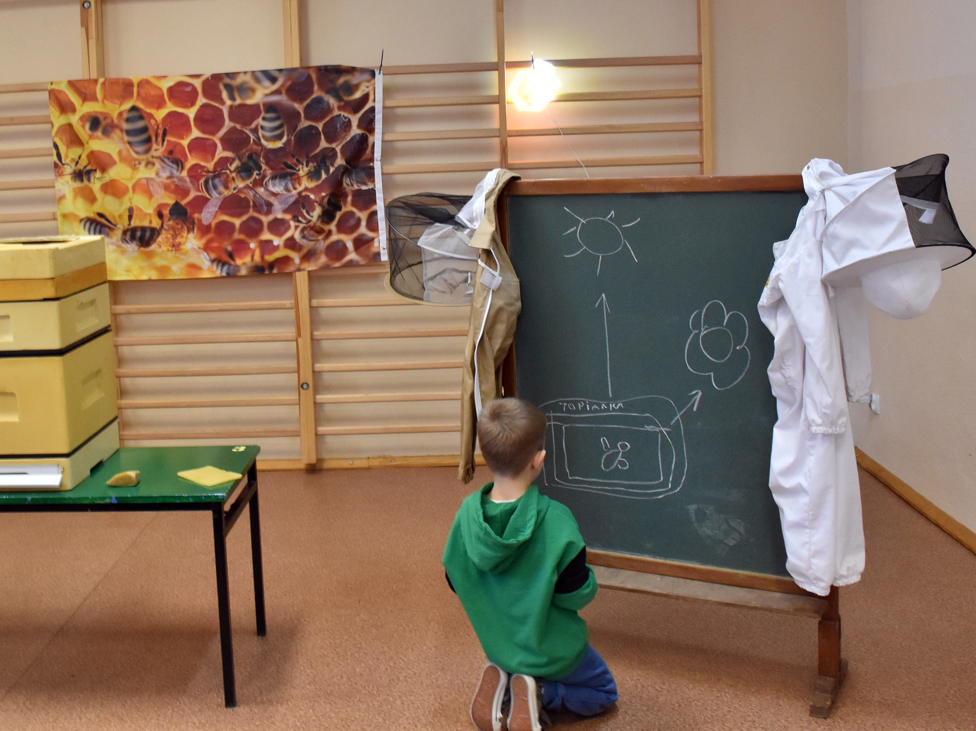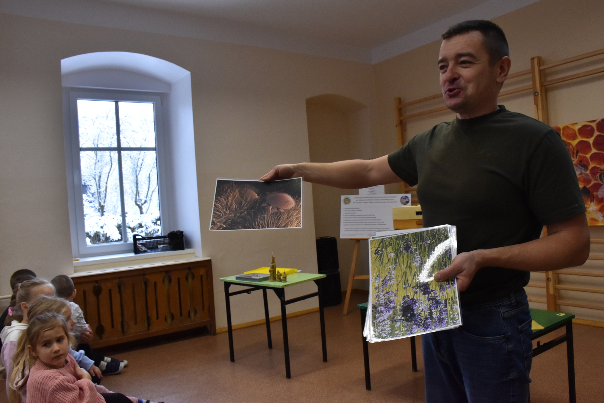 Podczas prezentacji dzieci miały okazję zobaczyć budowę ula oraz zrozumieć cykl rozwoju i budowę pszczoły miodnej. Pan Jacek zaprezentował także niezbędny strój ochronny oraz narzędzia i sprzęt, których używa podczas pracy przy ulach. Przybliżył nam również postać świętego Ambrożego, patrona pszczelarstwa. Spotkanie było interaktywne, a uczniowie wraz z nauczycielami aktywnie uczestniczyli, zadając wiele pytań. Wśród nich znalazły się nawet pytania dotyczące wymagań prawnych związanych z zawodem, co świadczy o dużym zainteresowaniu tematem. Wizyta ta nie tylko wzbogaciła wiedzę dzieci, ale także wzbudziła ich ciekawość i szacunek do tradycyjnych zawodów.