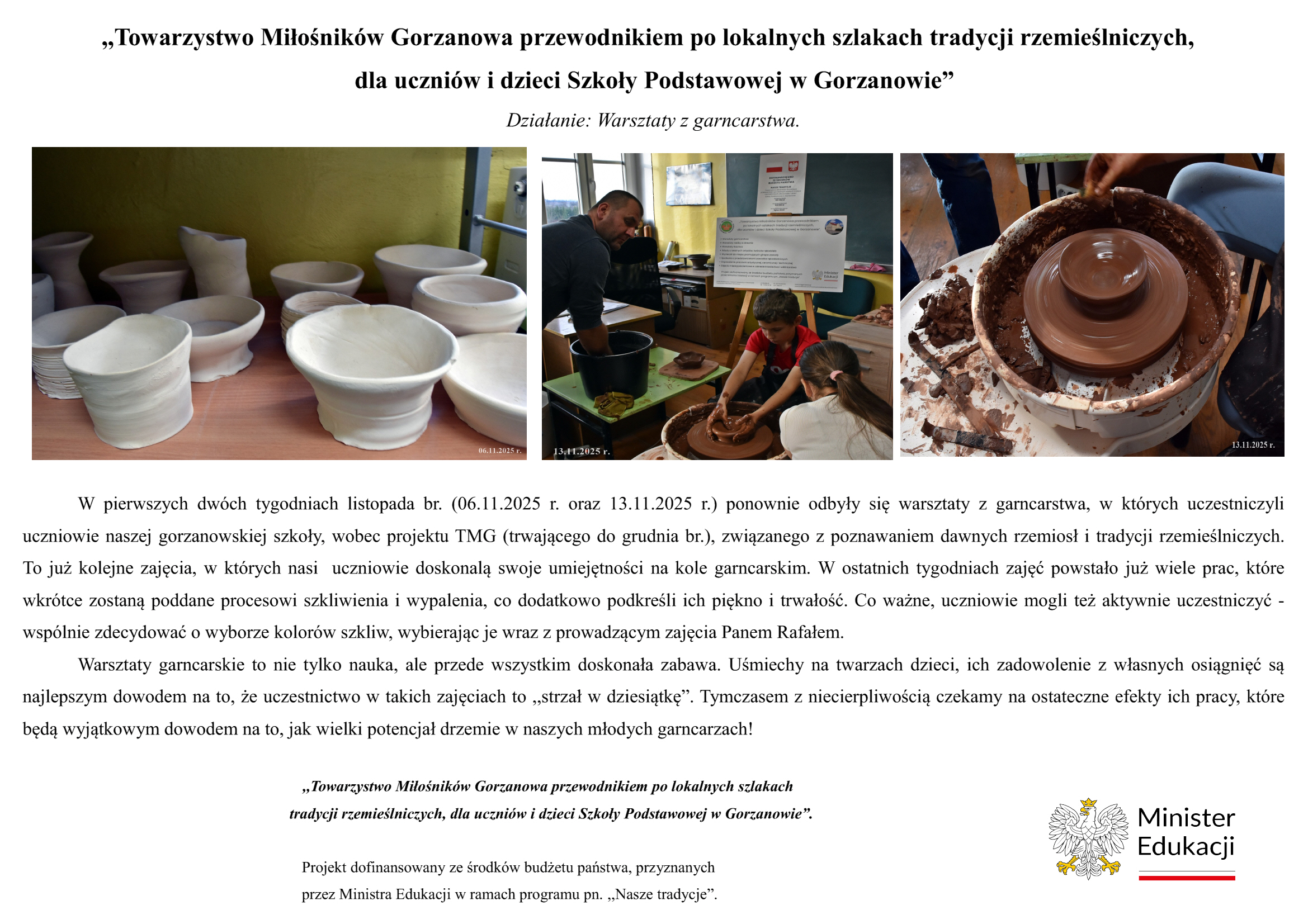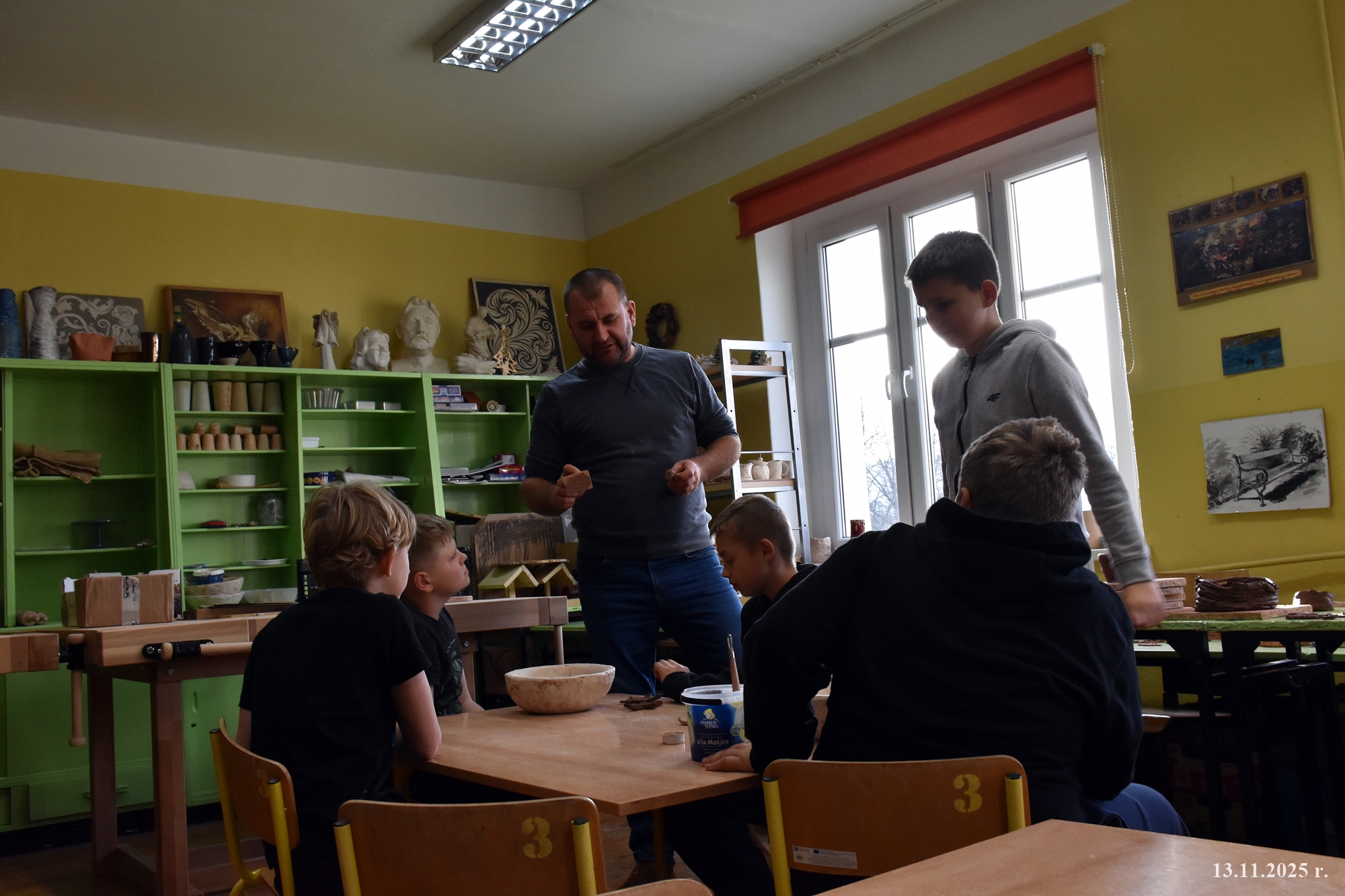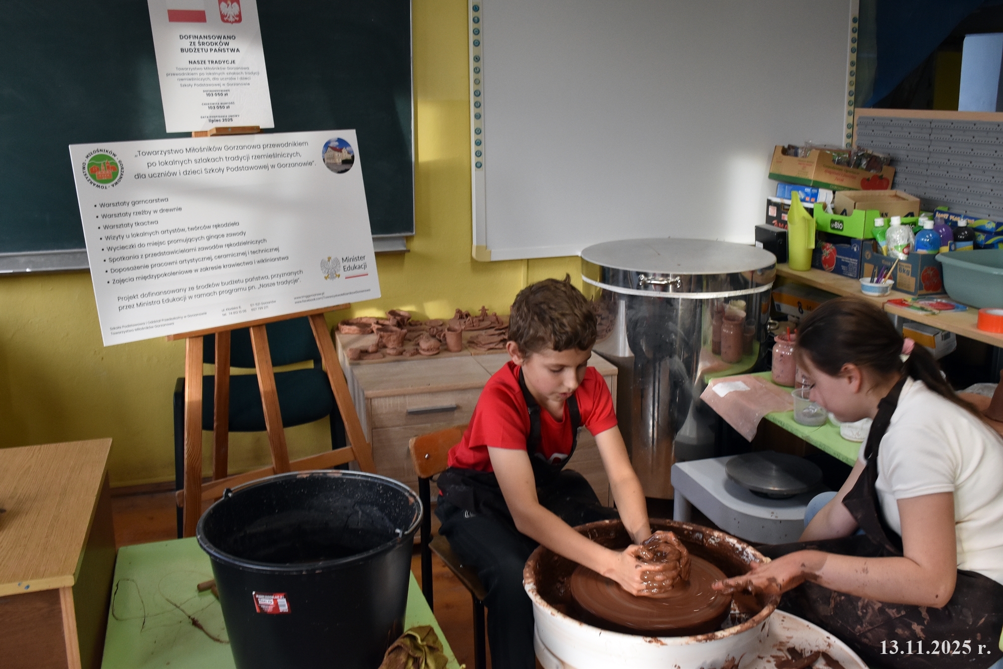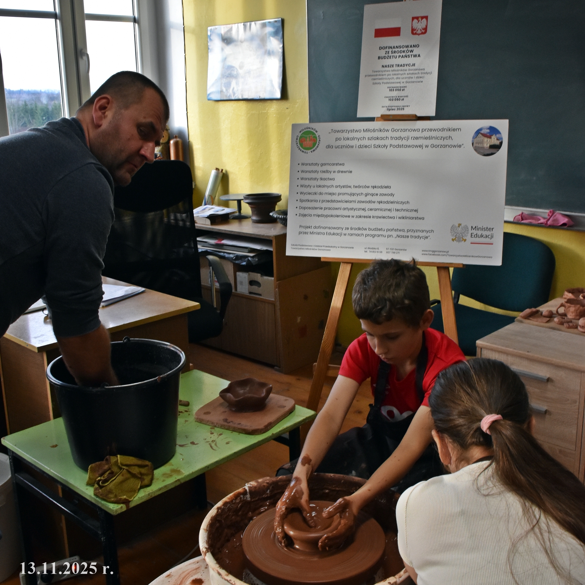 W pierwszych dwóch tygodniach listopada br. (06.11.2025 r. oraz 13.11.2025 r.) ponownie odbyły się warsztaty z garncarstwa, w których uczestniczyli uczniowie naszej gorzanowskiej szkoły, wobec projektu TMG (trwającego do grudnia br.), związanego z poznawaniem dawnych rzemiosł i tradycji rzemieślniczych.