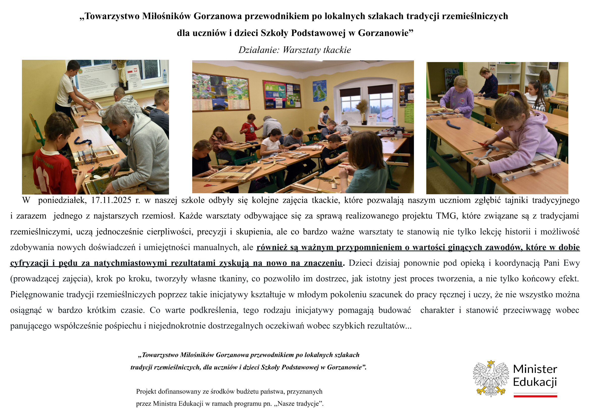Każde warsztaty odbywające się za sprawą realizowanego projektu TMG, które związane są z tradycjami rzemieślniczymi, uczą jednocześnie cierpliwości, precyzji i skupienia, ale co bardzo ważne warsztaty te stanowią nie tylko lekcję historii i możliwość zdobywania nowych doświadczeń i umiejętności manualnych, ale również są ważnym przypomnieniem o wartości ginących zawodów, które w dobie cyfryzacji i pędu za natychmiastowymi rezultatami zyskują na nowo na znaczeniu. Dzieci dzisiaj ponownie pod opieką i koordynacją Pani Ewy (prowadzącej zajęcia), krok po kroku, tworzyły własne tkaniny, co pozwoliło im dostrzec, jak istotny jest proces tworzenia, a nie tylko końcowy efekt. Pielęgnowanie tradycji rzemieślniczych poprzez takie inicjatywy kształtuje w młodym pokoleniu szacunek do pracy ręcznej i uczy, że nie wszystko można osiągnąć w bardzo krótkim czasie.