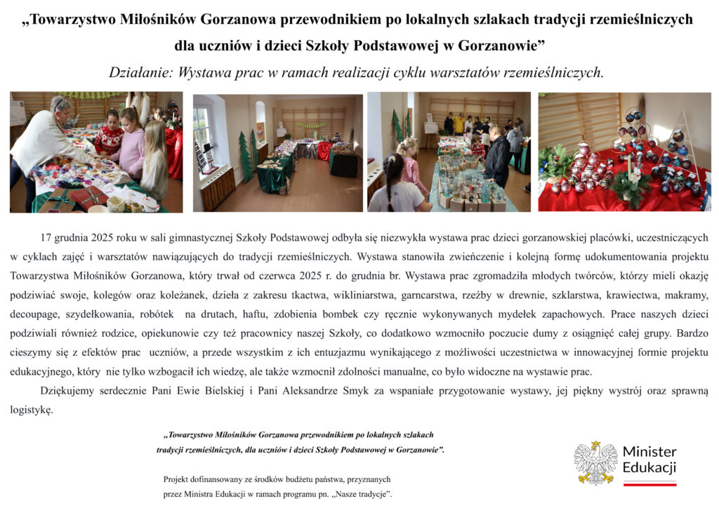 17 grudnia 2025 roku w sali gimnastycznej Szkoły Podstawowej odbyła się niezwykła wystawa prac dzieci gorzanowskiej placówki, uczestniczących w cyklach zajęć i warsztatów nawiązujących do tradycji rzemieślniczych. Wystawa stanowiła zwieńczenie i kolejną formę udokumentowania projektu Towarzystwa Miłośników Gorzanowa, który trwał od czerwca 2025 r. do grudnia br. Wystawa prac zgromadziła młodych twórców, którzy mieli okazję podziwiać swoje, kolegów oraz koleżanek, dzieła z zakresu tkactwa, wikliniarstwa, garncarstwa, rzeźby w drewnie, szklarstwa, krawiectwa, makramy, decoupage, szydełkowania, robótek na drutach, haftu, zdobienia bombek czy ręcznie wykonywanych mydełek zapachowych.