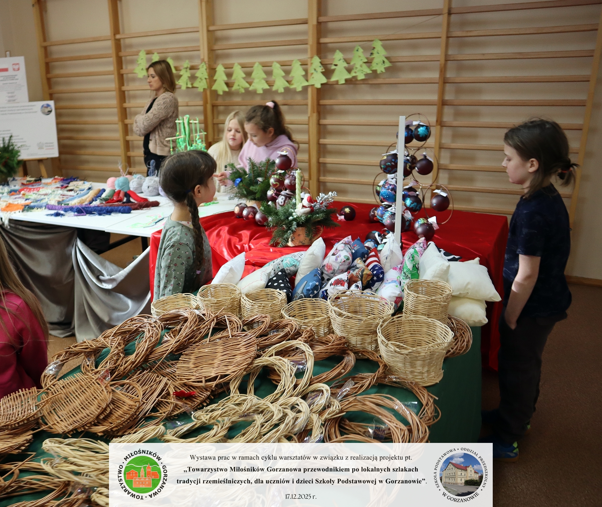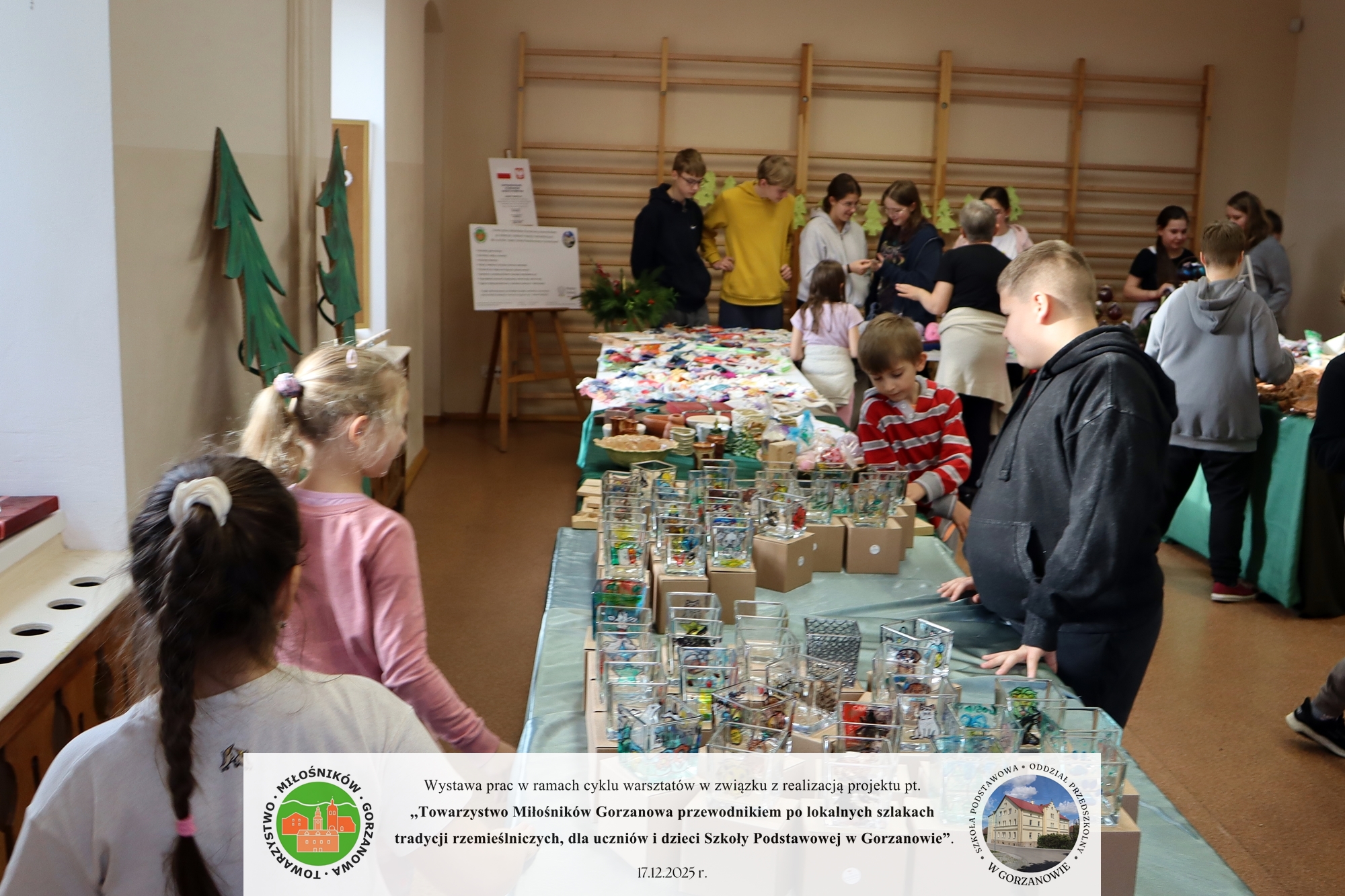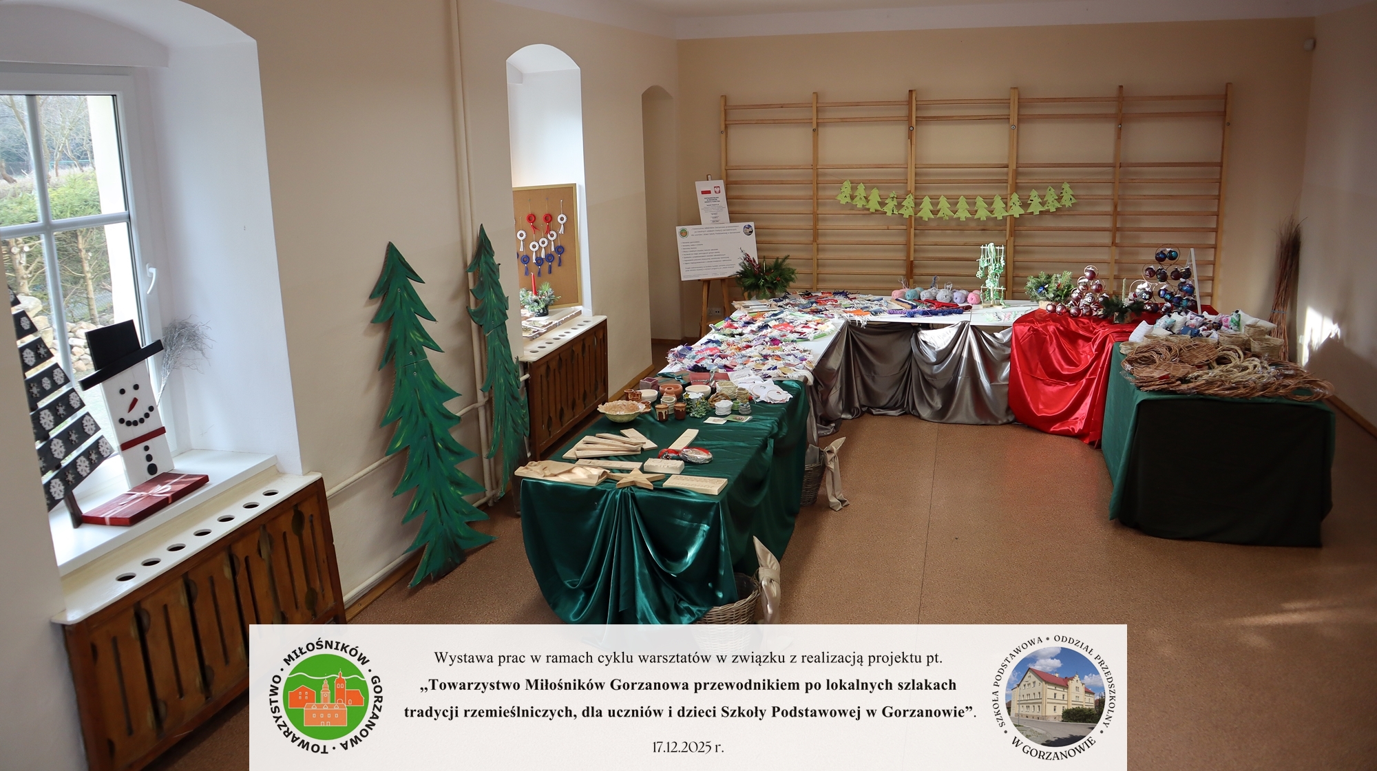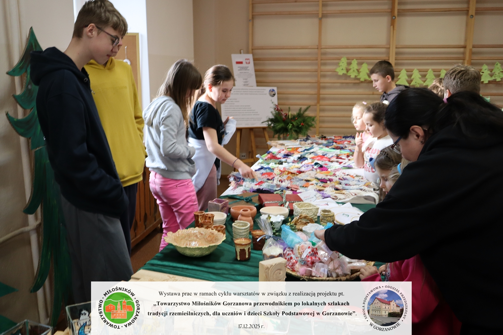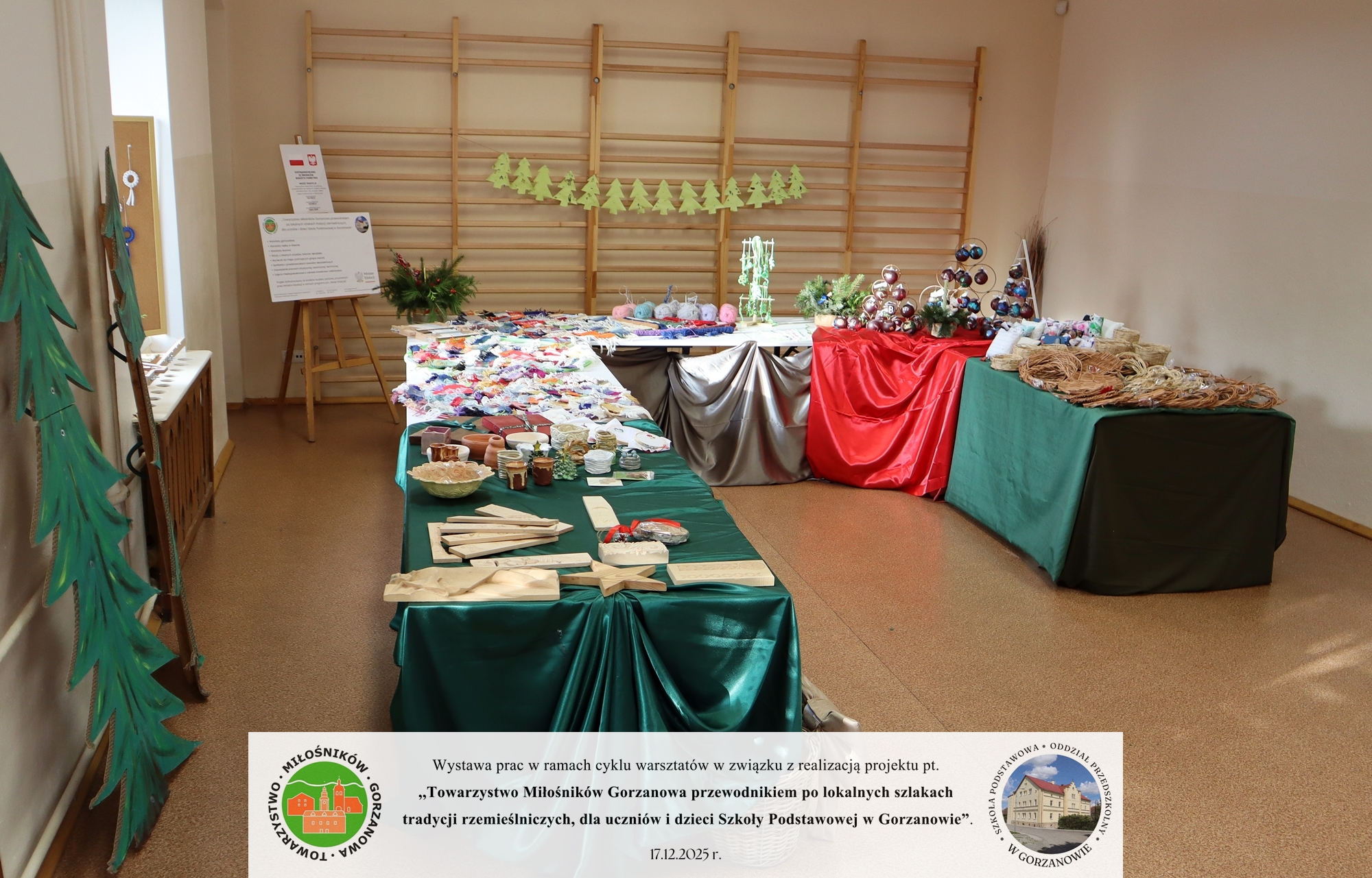 17 grudnia 2025 roku w sali gimnastycznej Szkoły Podstawowej odbyła się niezwykła wystawa prac dzieci gorzanowskiej placówki, uczestniczących w cyklach zajęć i warsztatów nawiązujących do tradycji rzemieślniczych. Wystawa stanowiła zwieńczenie i kolejną formę udokumentowania projektu Towarzystwa Miłośników Gorzanowa, który trwał od czerwca 2025 r. do grudnia br. Wystawa prac zgromadziła młodych twórców, którzy mieli okazję podziwiać swoje, kolegów oraz koleżanek, dzieła z zakresu tkactwa, wikliniarstwa, garncarstwa, rzeźby w drewnie, szklarstwa, krawiectwa, makramy, decoupage, szydełkowania, robótek na drutach, haftu, zdobienia bombek czy ręcznie wykonywanych mydełek zapachowych.
