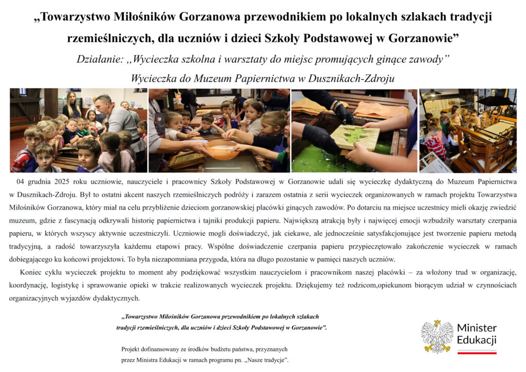 Projekt pt. ,,Towarzystwo Miłośników Gorzanowa przewodnikiem po lokalnych szlakach tradycji rzemieślniczych, dla uczniów i dzieci Szkoły Podstawowej w Gorzanowie”, dofinansowany ze środków budżetu państwa, przyznanych przez Ministra Edukacji w ramach programu pn. ,,Nasze tradycje”, moduł tematyczny: ,,Sztuka i rzemiosło”.