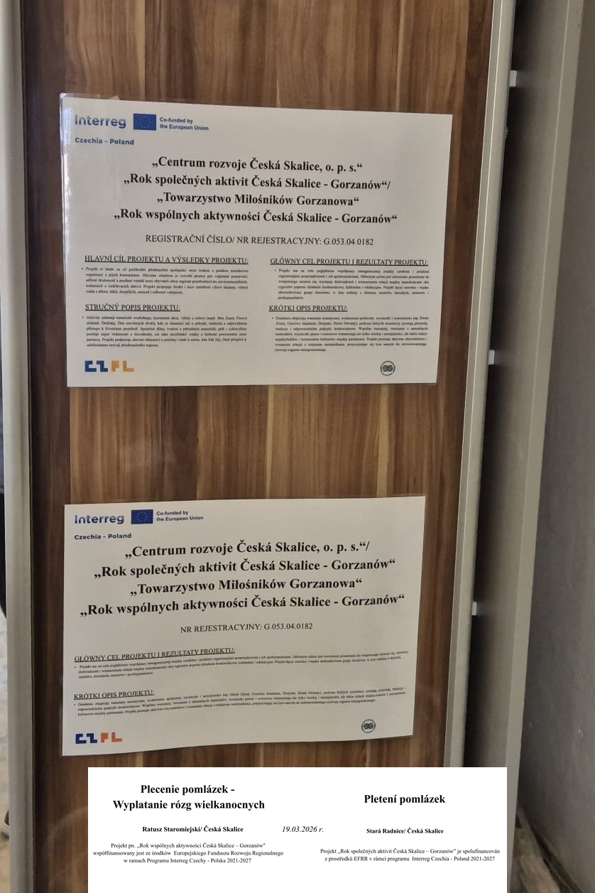 Projekt pn. ,,Rok wspólnych aktywności Česká Skalice – Gorzanów” współfinansowany jest ze środków Europejskiego Funduszu Rozwoju Regionalnego w ramach Programu Interreg Czechy – Polska 2021-2027 za pośrednictwem Euroregion Glacensis zarządzającym Funduszem Małych Projektów; Priorytet 4 ,,Współpraca Instytucji i Mieszkańców”, cel 4.2.