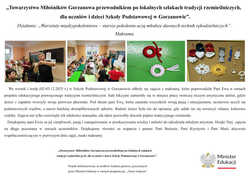 We wtorek i środę (02-03.12.2025 r.) w Szkole Podstawowej w Gorzanowie odbyły się zajęcia z makramy, które poprowadziła Pani Ewa w ramach projektu edukacyjnego poświęconego tradycjom rzemieślniczym. Sale lekcyjne zamieniły się w miejsce pracy twórczej niczym artystyczne atelier, gdzie dzieci z zapałem tworzyły swoje pierwsze plecionki. Pod okiem pani Ewy, która zarażała wszystkich swoją pasją i entuzjazmem, uczniowie uczyli się podstawowych węzłów, a nawet bardziej skomplikowanych splotów. Radość dzieci była nie do opisania, gdy udało im się stworzyć własne, kolorowe ozdoby. Zajęcia nie tylko rozwinęły ich zdolności manualne, ale także pozwoliły docenić piękno tradycyjnego rzemiosła.🙂