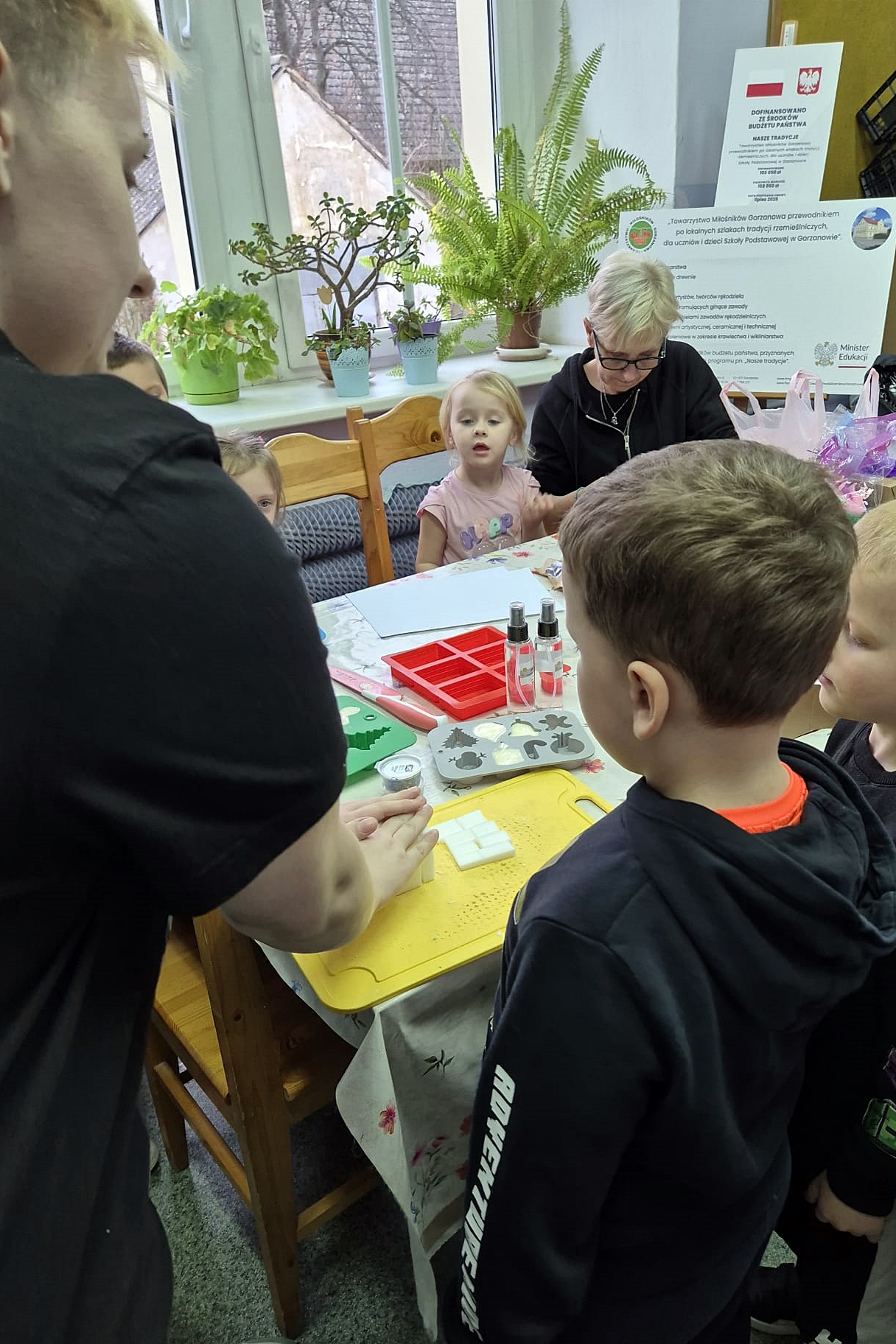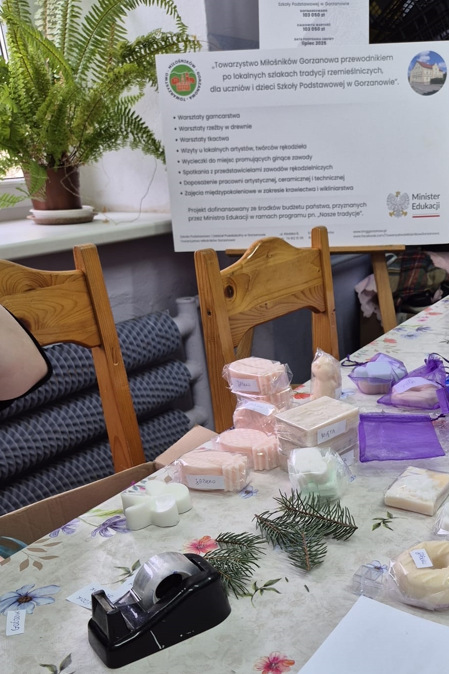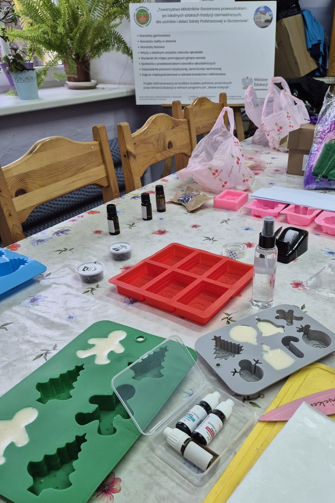 We wtorek (09.12.2025 r.) w naszej małej Szkole Podstawowej w Gorzanowie odbyły się warsztaty w ramach projektu edukacyjnego dotyczącego tradycji rzemieślniczych. Tematem przewodnim była sztuka tworzenia ręcznie wykonanych mydełek zapachowych. Wydarzenie to przyciągnęło uwagę nie tylko naszych dzieci, alei nauczycieli i pracowników, którzy z zainteresowaniem przyglądali się pracy swojej byłej uczennicy, absolwentki, Pani Wiktorii.