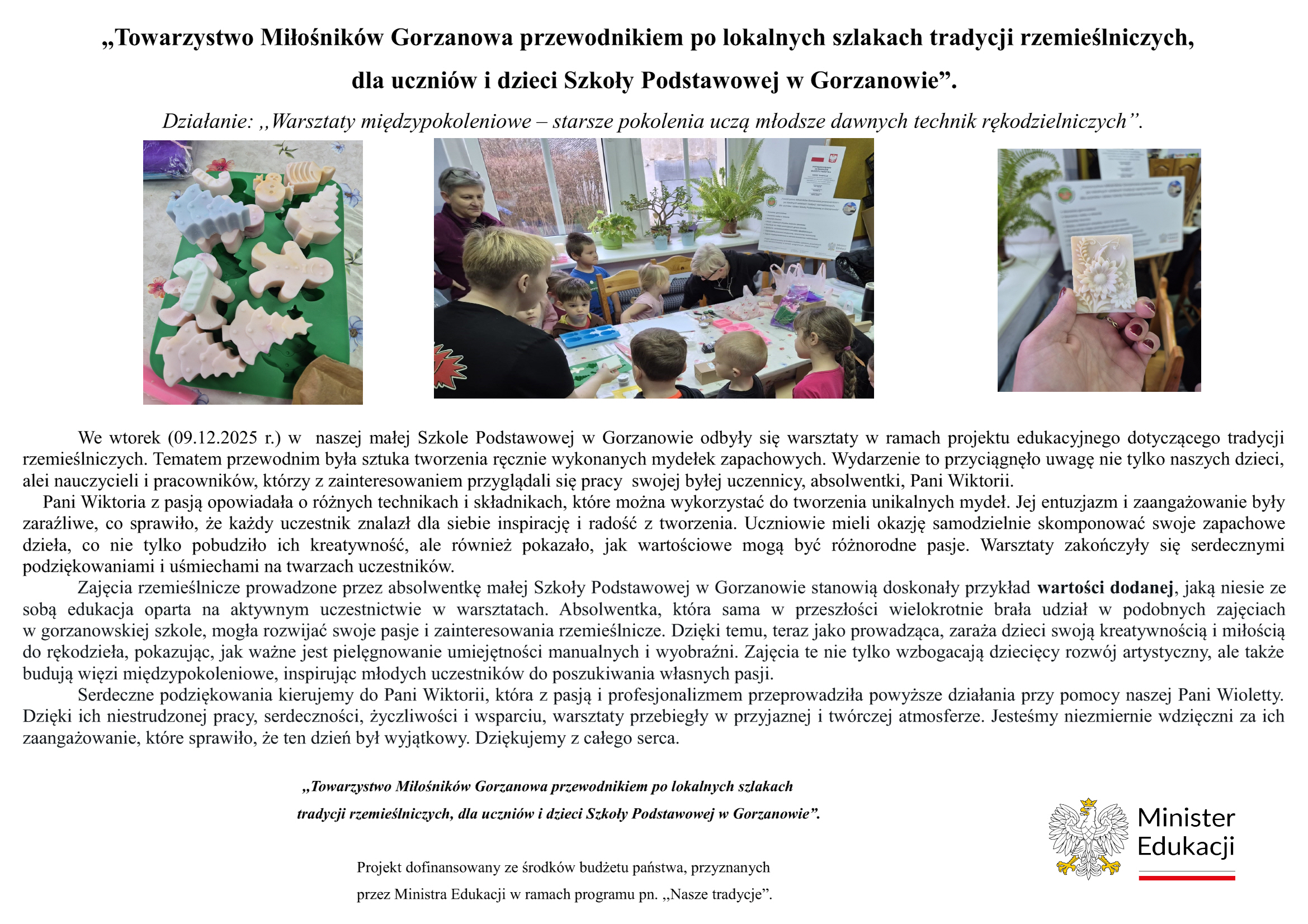 17 grudnia 2025 roku w sali gimnastycznej Szkoły Podstawowej odbyła się niezwykła wystawa prac dzieci gorzanowskiej placówki, uczestniczących w cyklach zajęć i warsztatów nawiązujących do tradycji rzemieślniczych. Wystawa stanowiła zwieńczenie i kolejną formę udokumentowania projektu Towarzystwa Miłośników Gorzanowa, który trwał od czerwca 2025 r. do grudnia br. Wystawa prac zgromadziła młodych twórców, którzy mieli okazję podziwiać swoje, kolegów oraz koleżanek, dzieła z zakresu tkactwa, wikliniarstwa, garncarstwa, rzeźby w drewnie, szklarstwa, krawiectwa, makramy, decoupage, szydełkowania, robótek na drutach, haftu, zdobienia bombek czy ręcznie wykonywanych mydełek zapachowych.