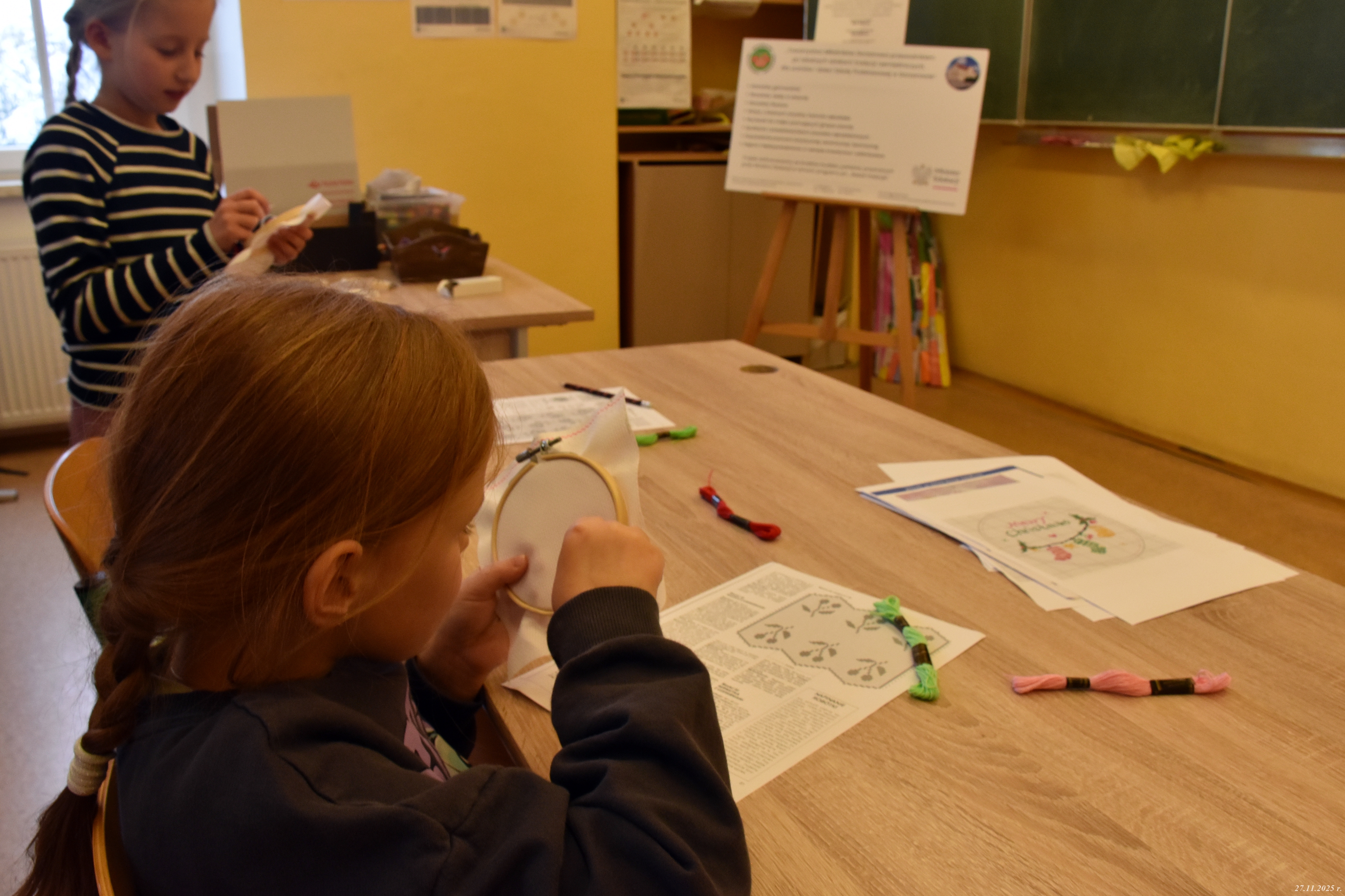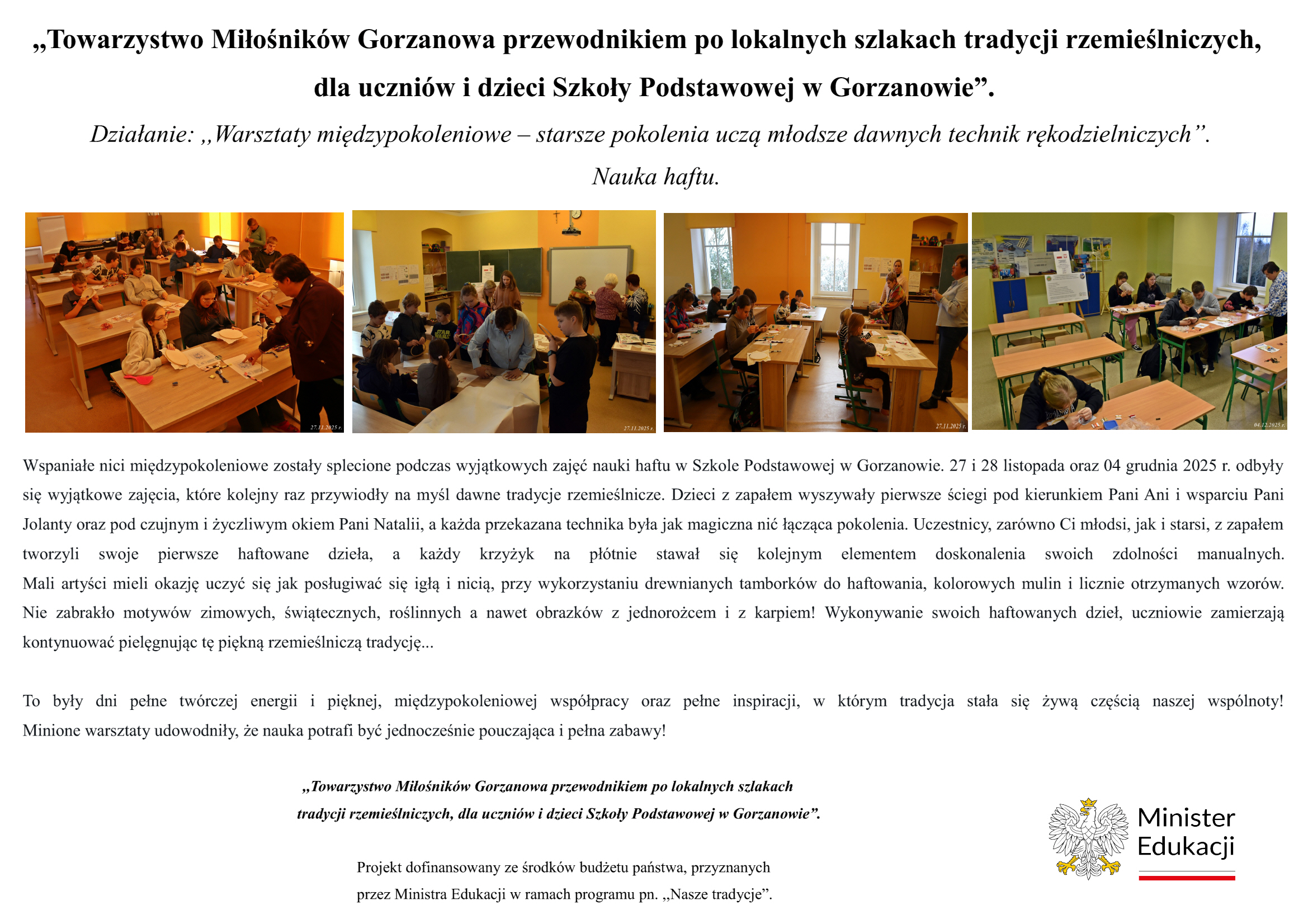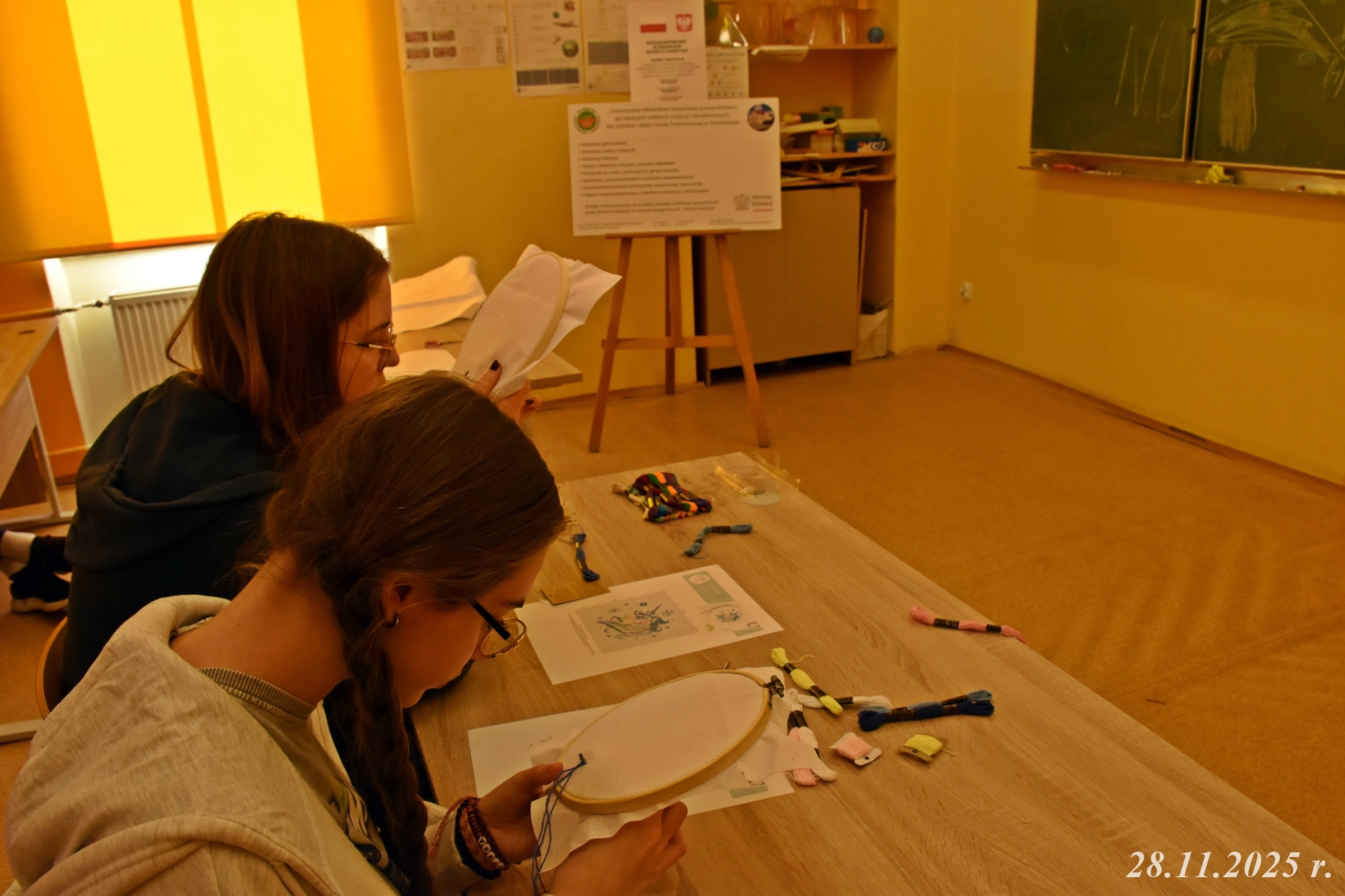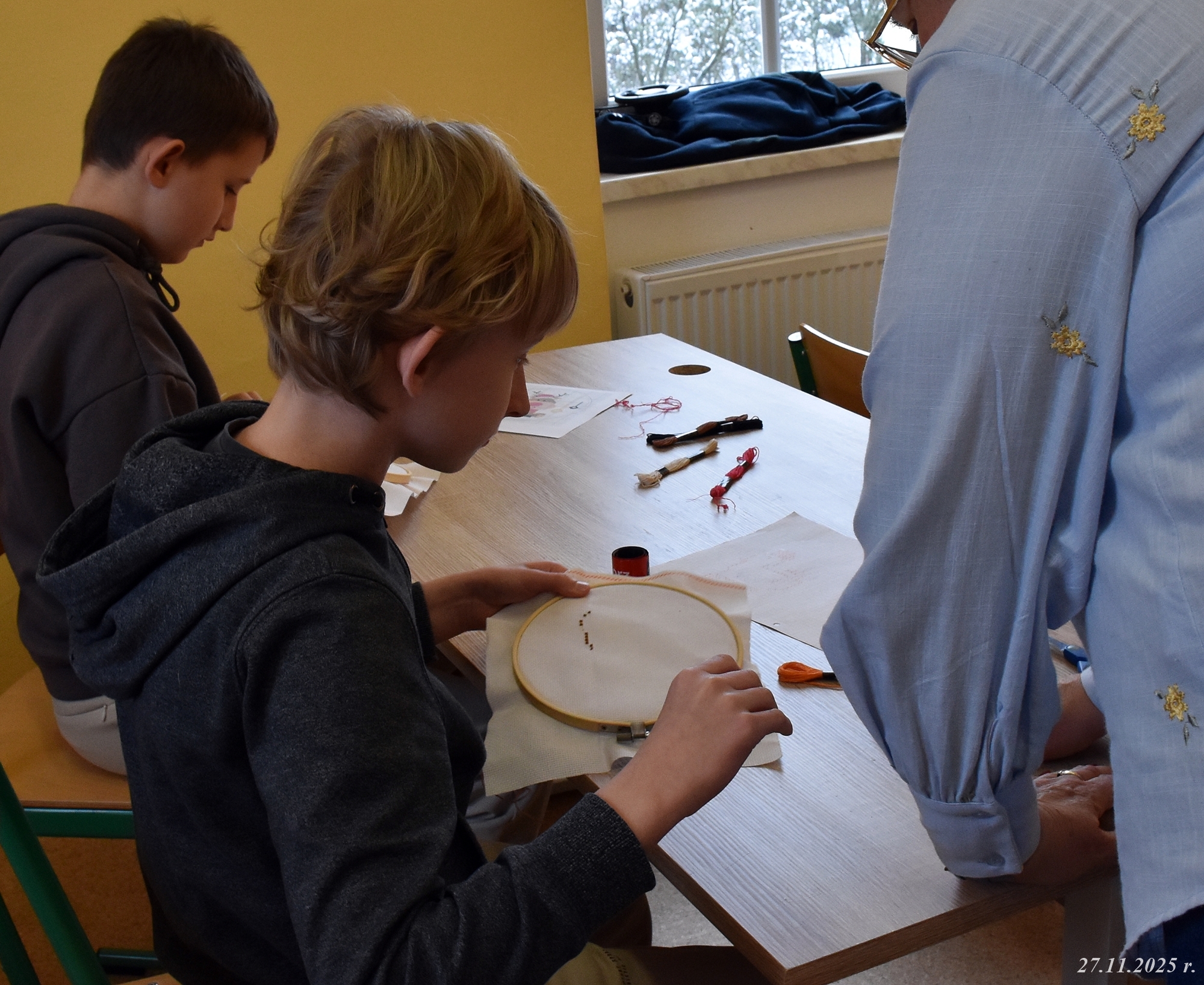 Wspaniałe nici międzypokoleniowe zostały splecione podczas wyjątkowych zajęć nauki haftu w Szkole Podstawowej w Gorzanowie. 27 i 28 listopada oraz 04 grudnia 2025 r. odbyły się wyjątkowe zajęcia, które kolejny raz przywiodły na myśl dawne tradycje rzemieślnicze. Dzieci z zapałem wyszywały pierwsze ściegi pod kierunkiem Pani Ani i wsparciu Pani Jolanty oraz pod czujnym i życzliwym okiem Pani Natalii, a każda przekazana technika była jak magiczna nić łącząca pokolenia. Uczestnicy, zarówno Ci młodsi, jak i starsi, z zapałem tworzyli swoje pierwsze haftowane dzieła, a każdy krzyżyk na płótnie stawał się kolejnym elementem doskonalenia swoich zdolności manualnych. Mali artyści mieli okazję uczyć się jak posługiwać się igłą i nicią, przy wykorzystaniu drewnianych tamborków do haftowania, kolorowych mulin i licznie otrzymanych wzorów. Nie zabrakło motywów zimowych, świątecznych, roślinnych a nawet obrazków z jednorożcem i z karpiem! Wykonywanie swoich haftowanych dzieł, uczniowie zamierzają kontynuować pielęgnując tę piękną rzemieślniczą tradycję…