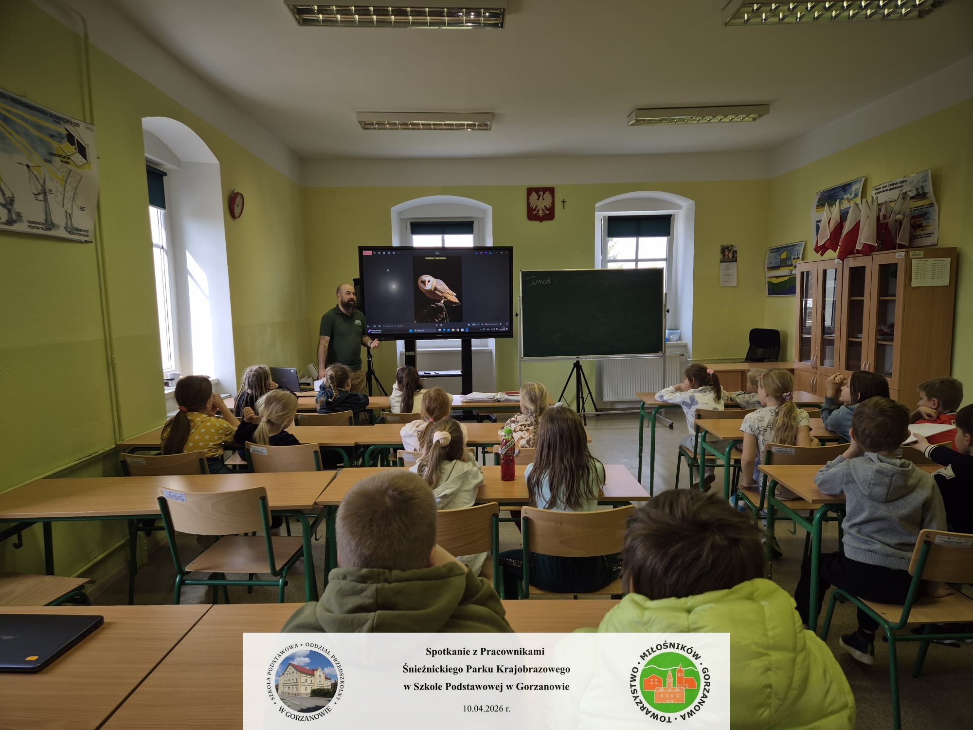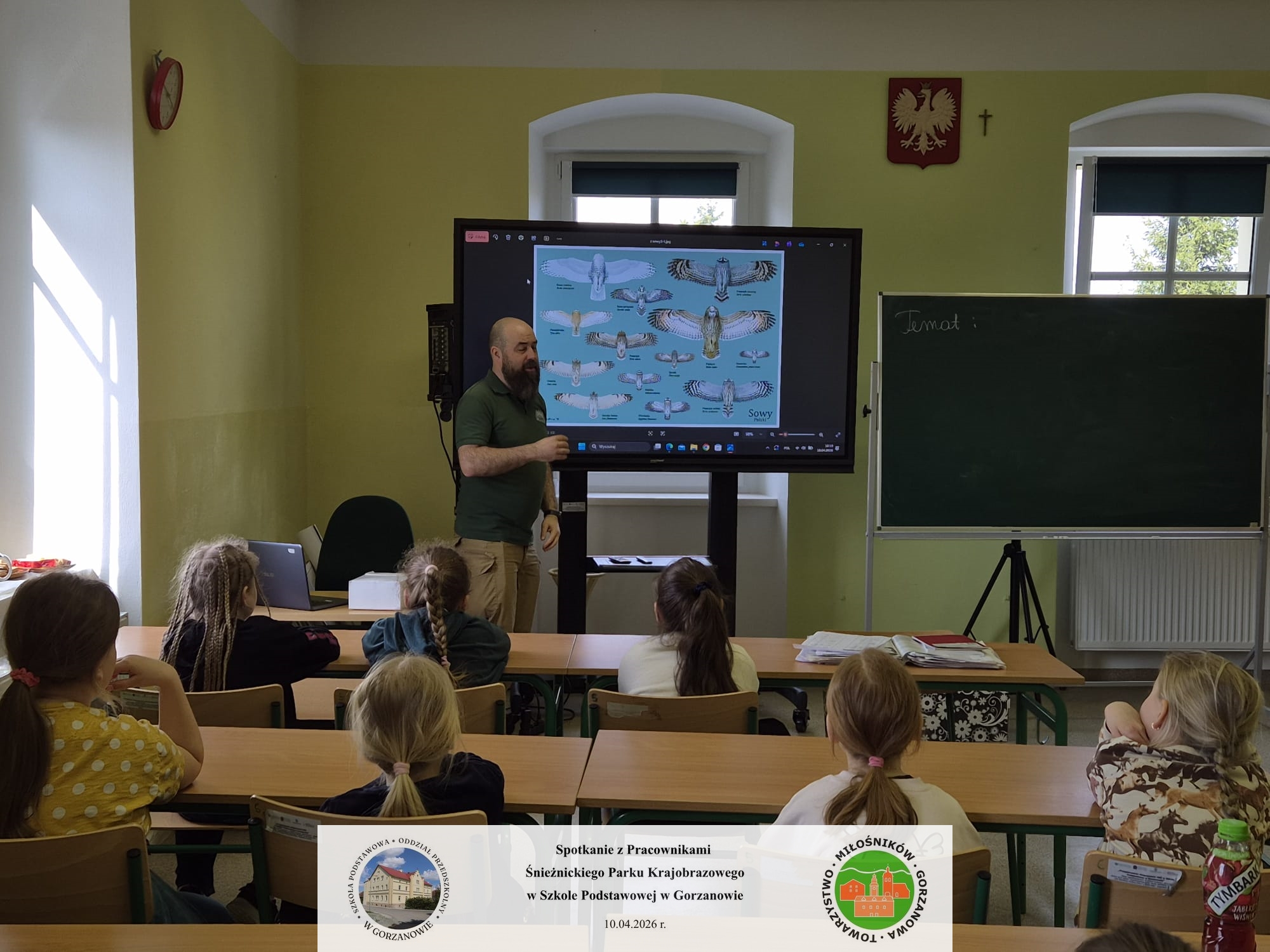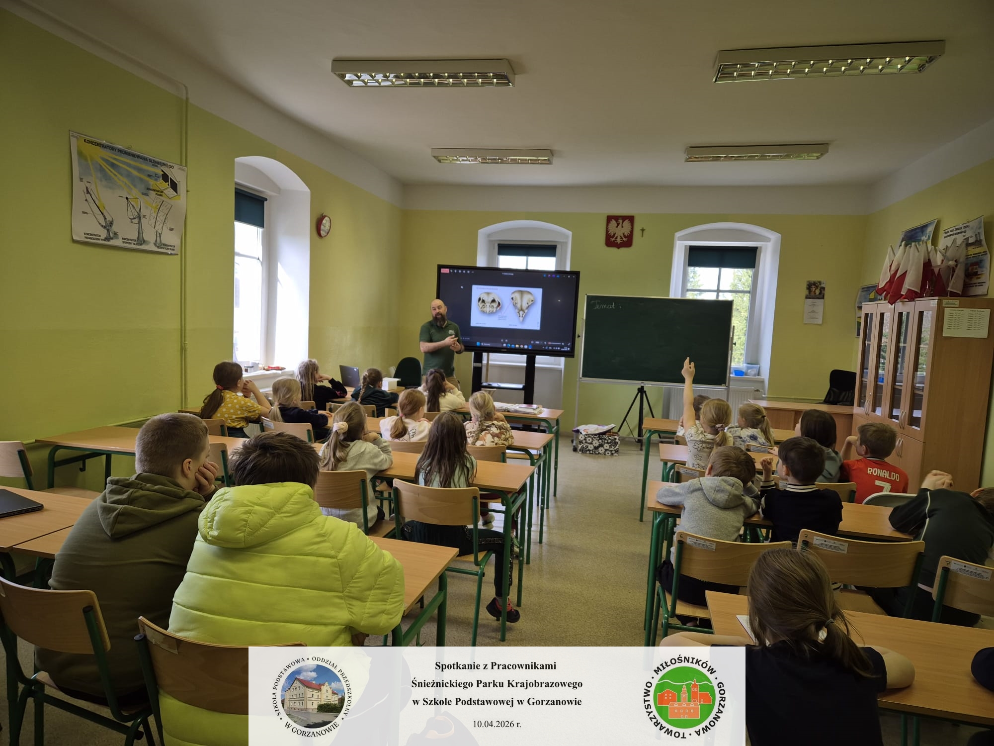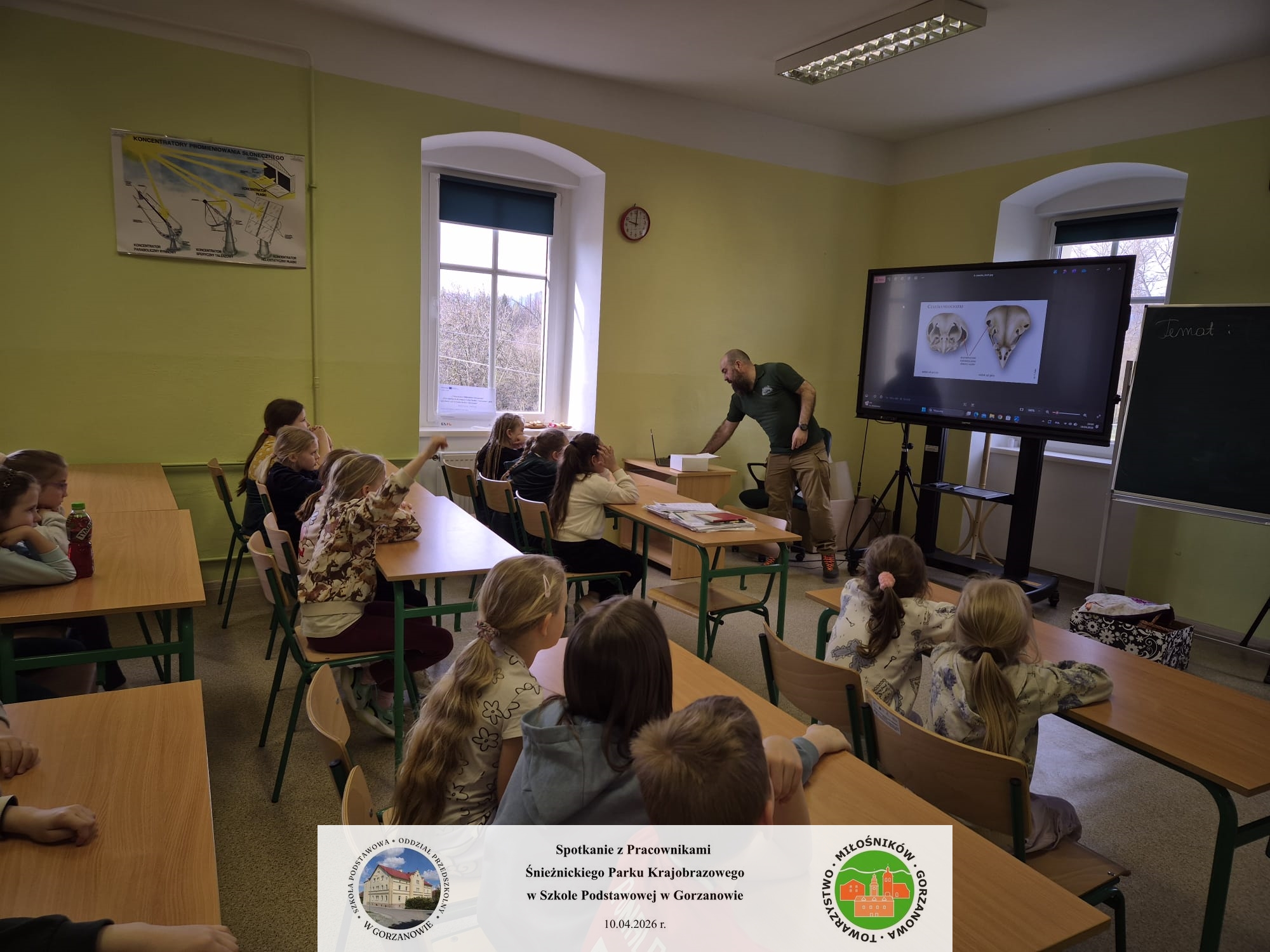 Wiosenny, deszczowy poranek, wcale nie musi być ponury i smutny. Nauczyciele w Szkole w Gorzanowie, wiedzą, jak urozmaicić swoim wychowankom dzień i odpowiednio zadbać o ich dobrostan psychiczny. Odpowiadając na zainteresowania i potrzeby uczniów Naszej Szkoły, 10 kwietnia br. odwiedzili po raz kolejny cudowni i kompetentni specjaliści, tym razem ze Śnieżnickiego Parku Krajobrazowego, co było też związane z tematyką trwającego początkiem miesiąca Uczniowskiego Projektu Edukacyjnego w naszej placówce.
