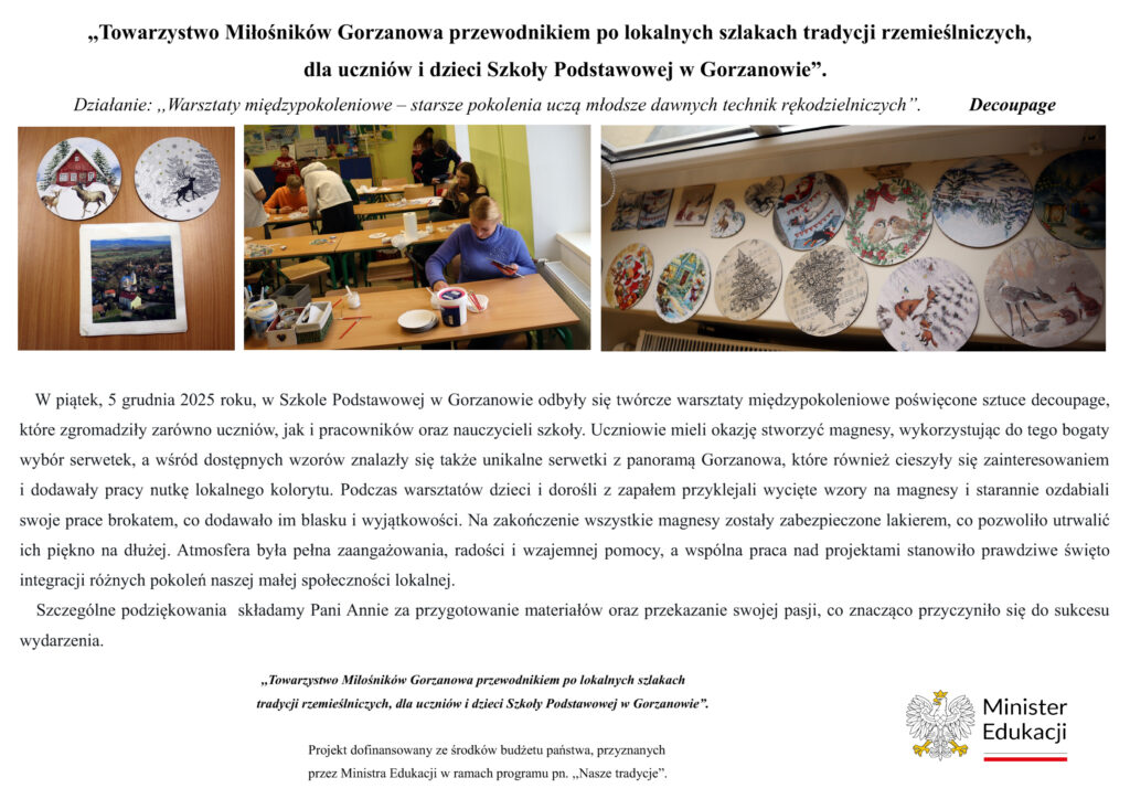 W piątek, 05 grudnia 2025 roku, w Szkole Podstawowej w Gorzanowie odbyły się twórcze warsztaty międzypokoleniowe poświęcone sztuce decoupage, które zgromadziły zarówno uczniów, jak i pracowników oraz nauczycieli szkoły.