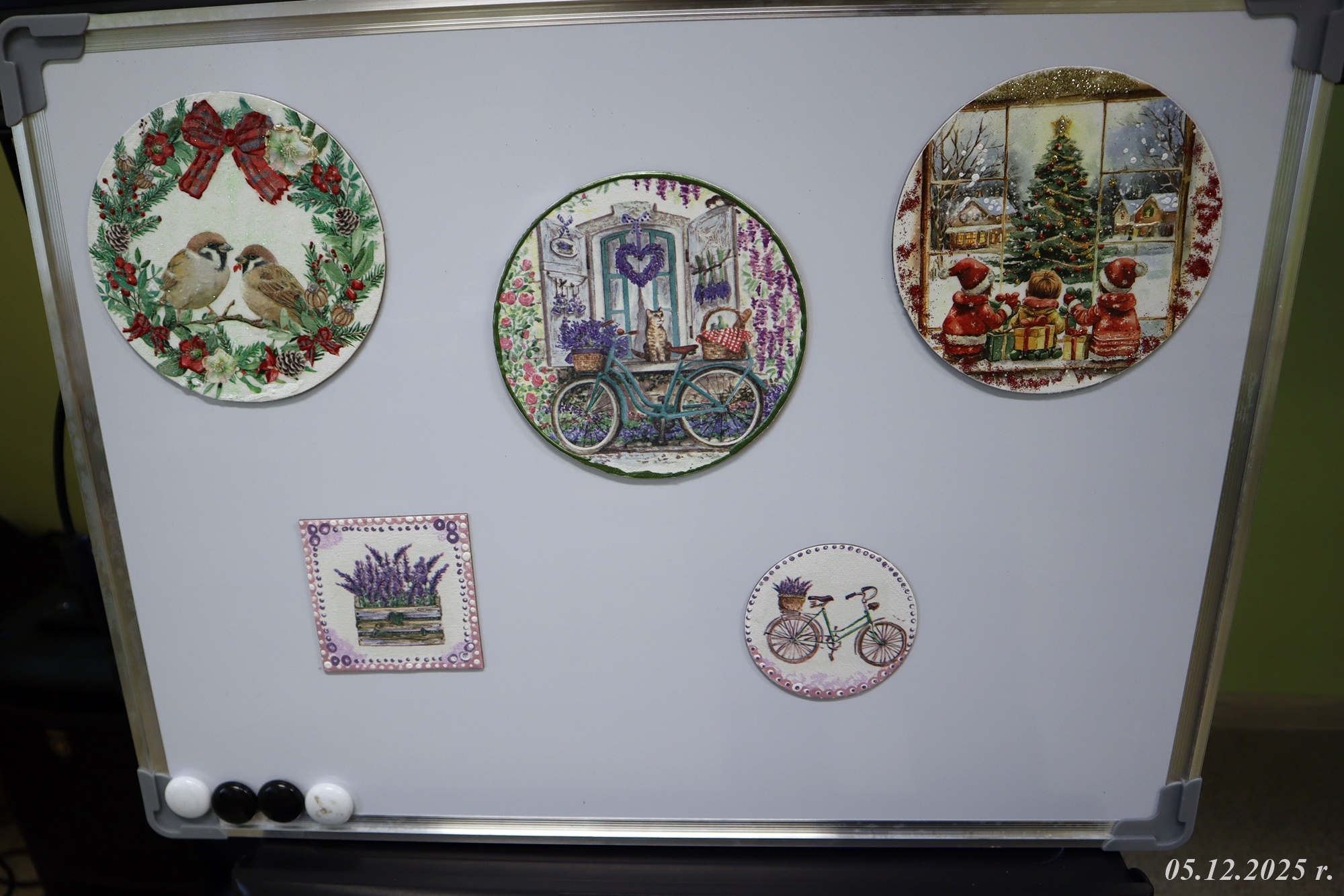 Podczas warsztatów dzieci i dorośli z zapałem przyklejali wycięte wzory na magnesy i starannie ozdabiali swoje prace brokatem, co dodawało im blasku i wyjątkowości. Na zakończenie wszystkie magnesy zostały zabezpieczone lakierem, co pozwoliło utrwalić ich piękno na dłużej. Atmosfera była pełna zaangażowania, radości i wzajemnej pomocy 🫶, a wspólna praca nad projektami stanowiło prawdziwe święto integracji różnych pokoleń naszej małej społeczności lokalnej 👥.