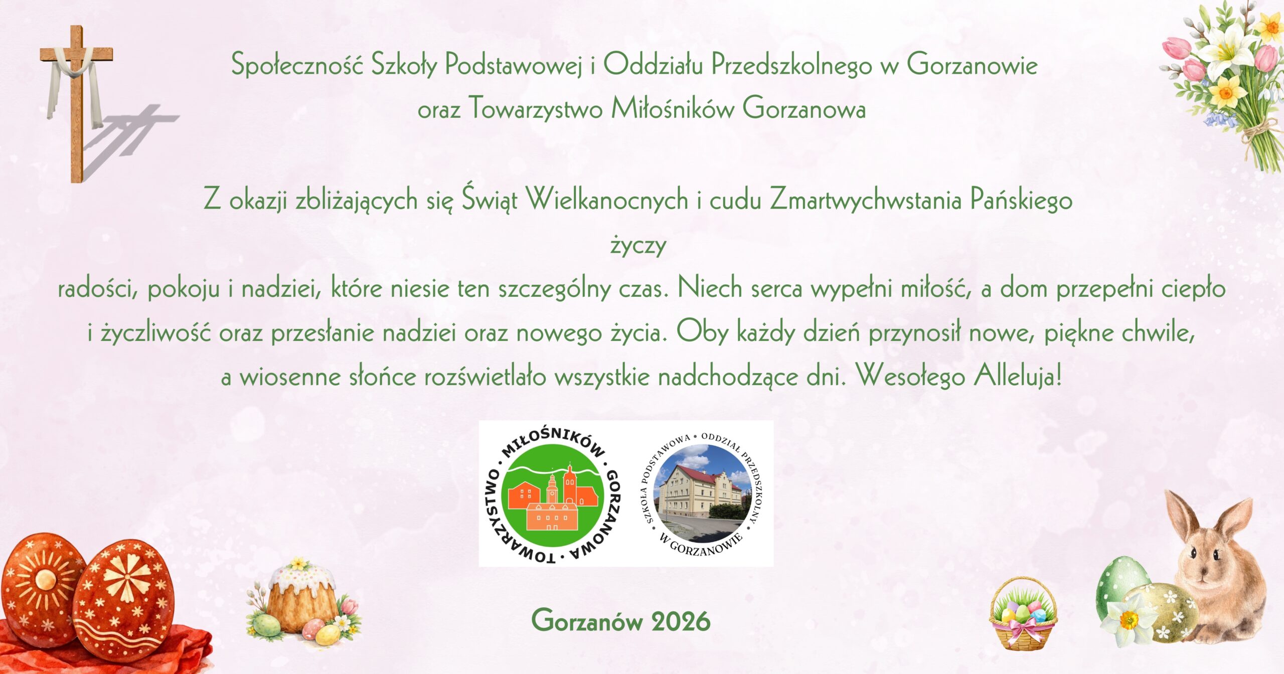 Społeczność Szkoły Podstawowej i Oddziału Przedszkolnego w Gorzanowie oraz Towarzystwo Miłośników Gorzanowa z okazji zbliżających się Świąt Wielkanocnych i cudu Zmartwychwstania Pańskiego życzy radości, pokoju i nadziei, które niesie ten szczególny czas. Niech serca wypełni miłość, a dom przepełni ciepło i życzliwość oraz przesłanie nadziei oraz nowego życia. Oby każdy dzień przynosił nowe, piękne chwile, a wiosenne słońce rozświetlało wszystkie nadchodzące dni.